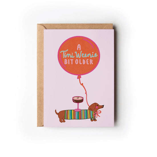Send a tini weenie birthday wish with this adorable 5x7 birthday card, featuring an espresso martini glass carried on the back of a dachshund/weenie dog and the phrase "a tini weenie bit older".