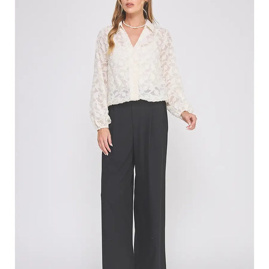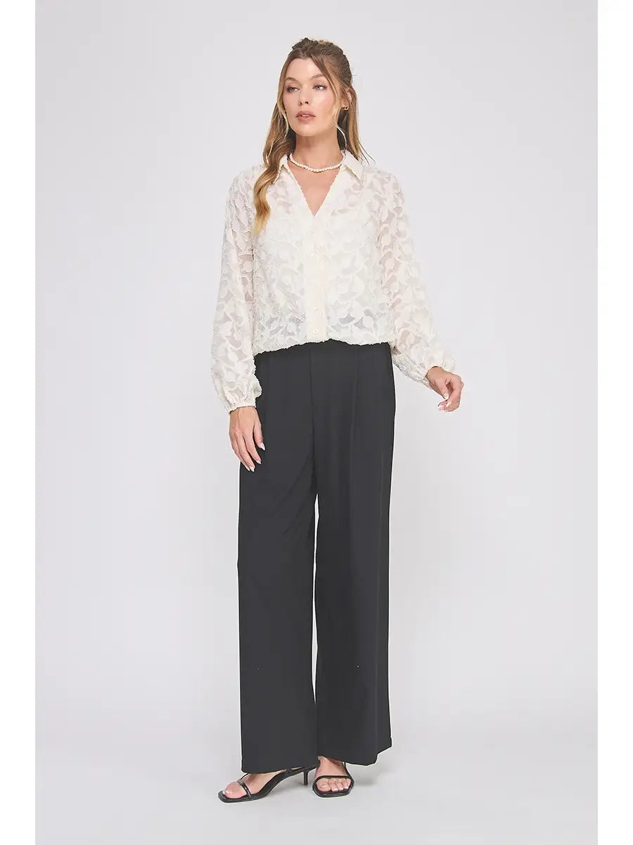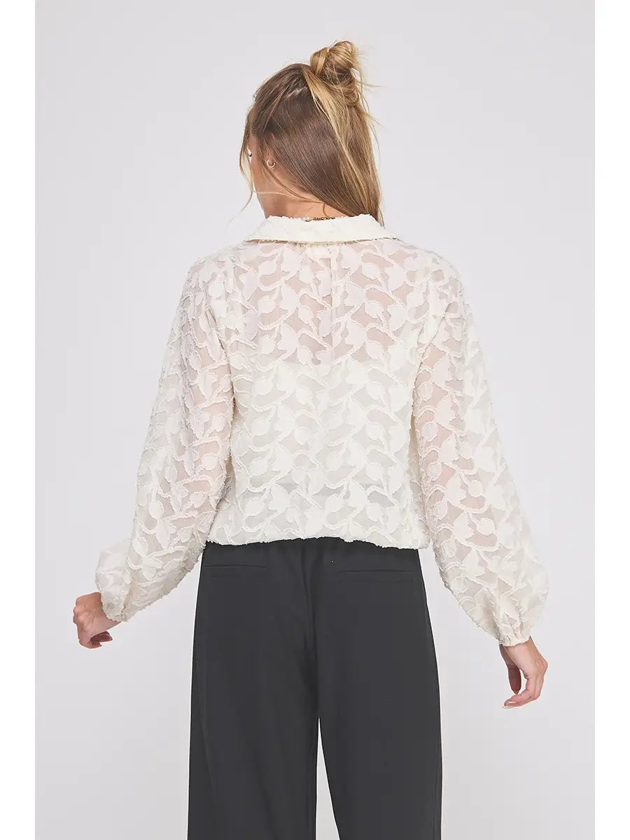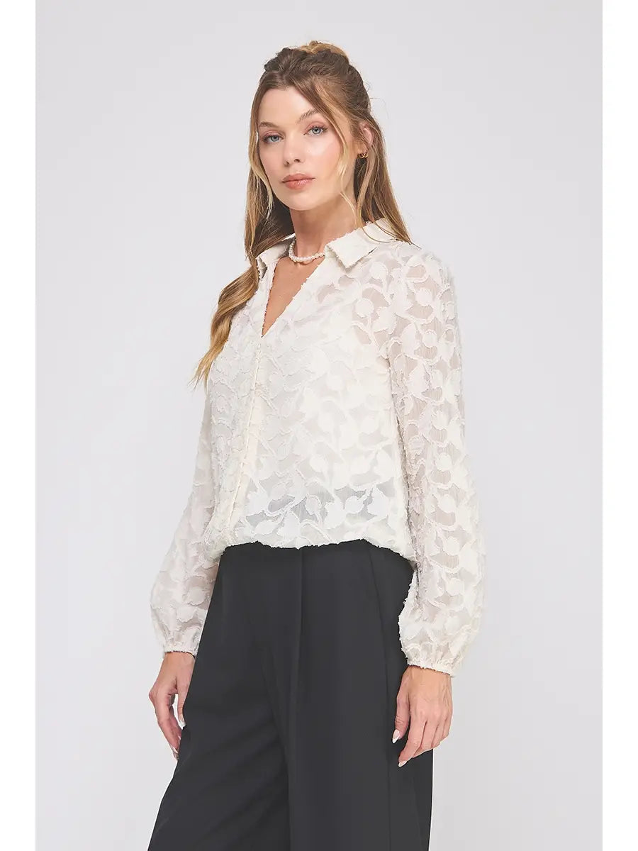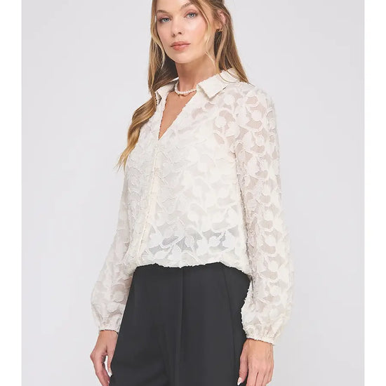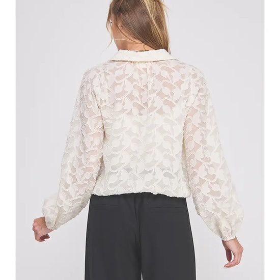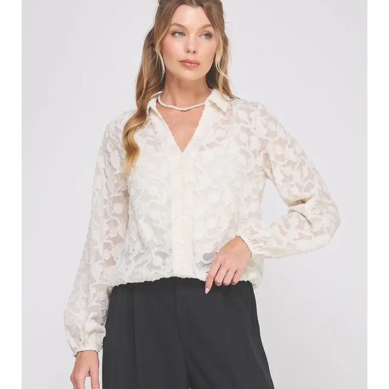 The Dove Button Up feels like pure romance in a top. Designed in a dreamy creamy jacquard burnout, this long sleeve blouse drapes softly while the delicate texture catches the light in all the right ways. The elastic waist pulls everything together with a flattering, feminine silhouette—no tucking required.