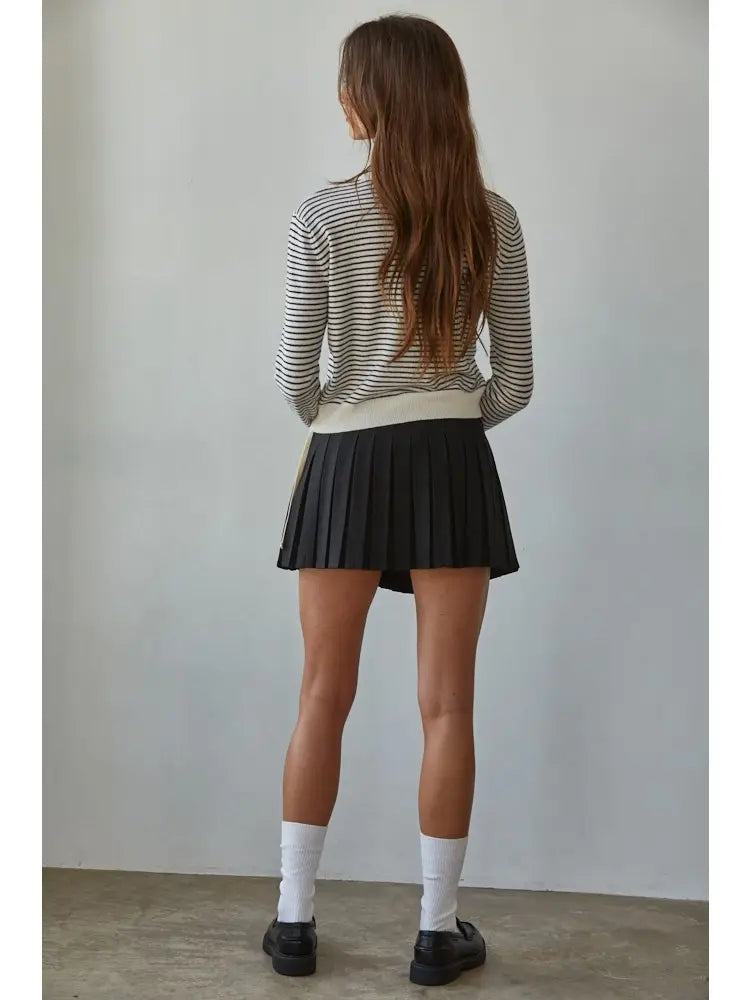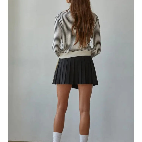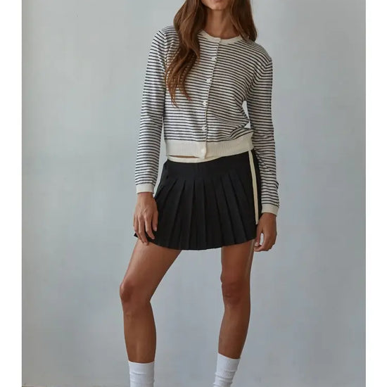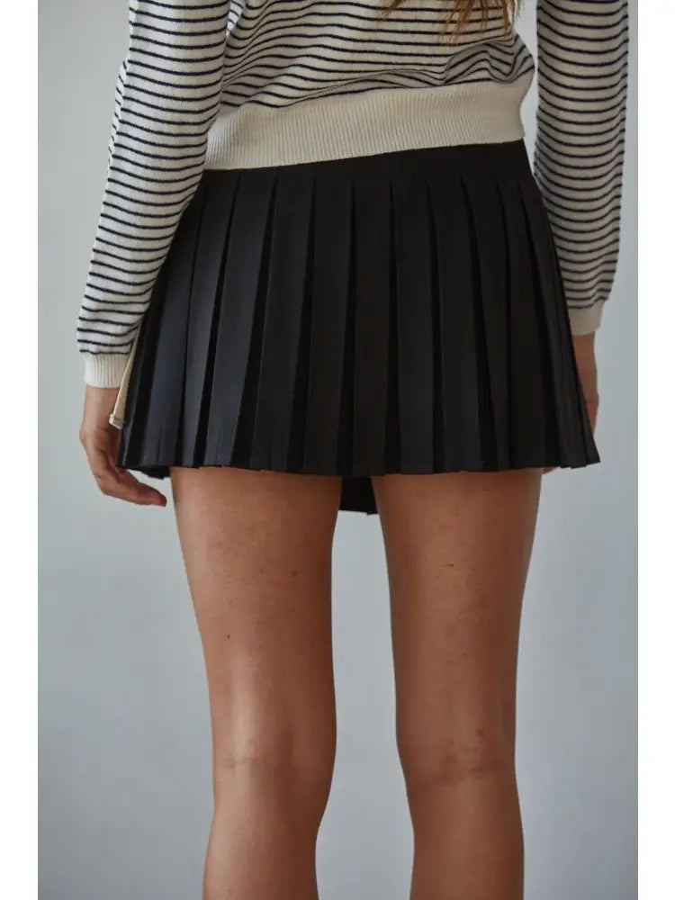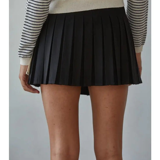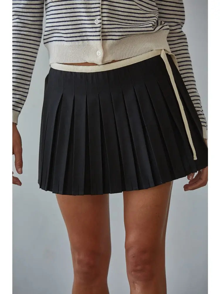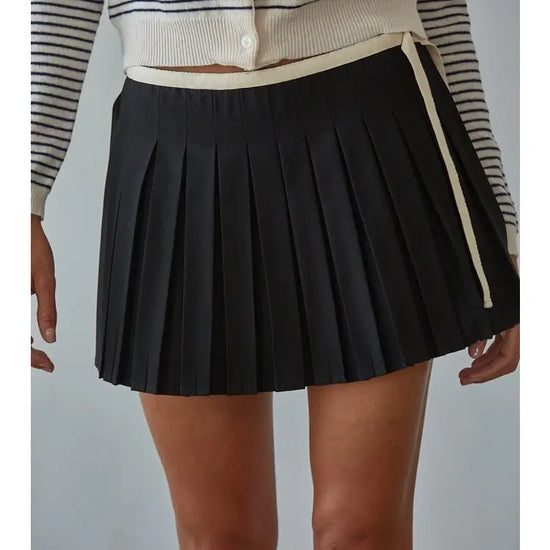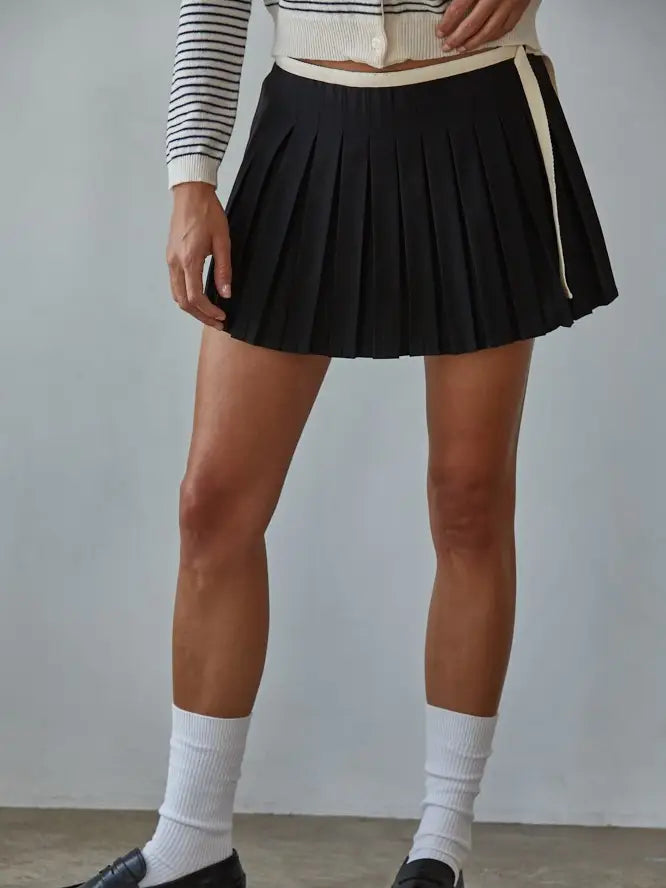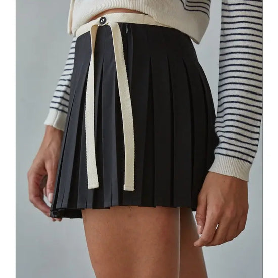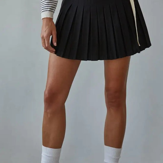 The Astrid Pleated Mini Skirt brings a playful prep school vibe with its woven cotton-rayon-spandex blend and crisp pleats. Featuring a side zipper and a cute twill tape strap with button details at the waist, this skort combines style and comfort effortlessly. Hidden shorts underneath add a fun, practical touch, making it perfect for all-day wear.
