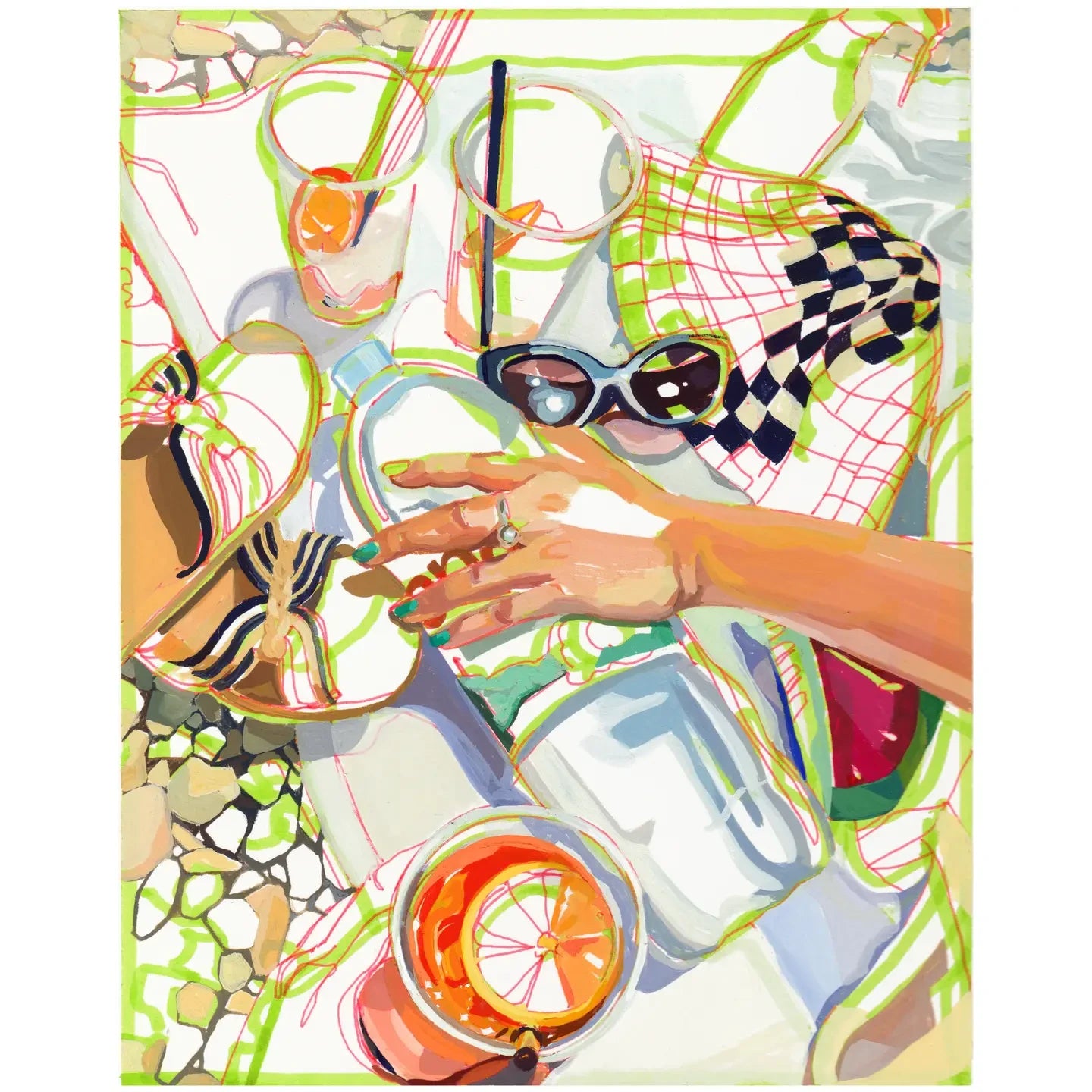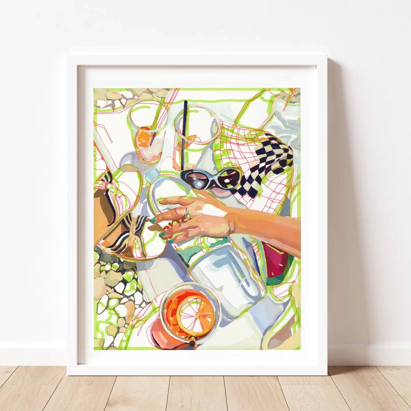 The sunniest beach day in Omis, Croatia with aperol spritzes, sunglasses, sandals, checkered hat, watermelon claw clip and a Jana water bottle was originally drawn with markers and painted over with gouache paint, and is now transformed into a vibrant giclee print on archival quality paper. The vibrant lime green, glistening orange, magenta, and calm blue hues are brought to life with the pigment inks used to create this signed print on sturdy 300gsm archival fine art paper. It was a true delight to paint and I hope you'll love to hang it in your home!