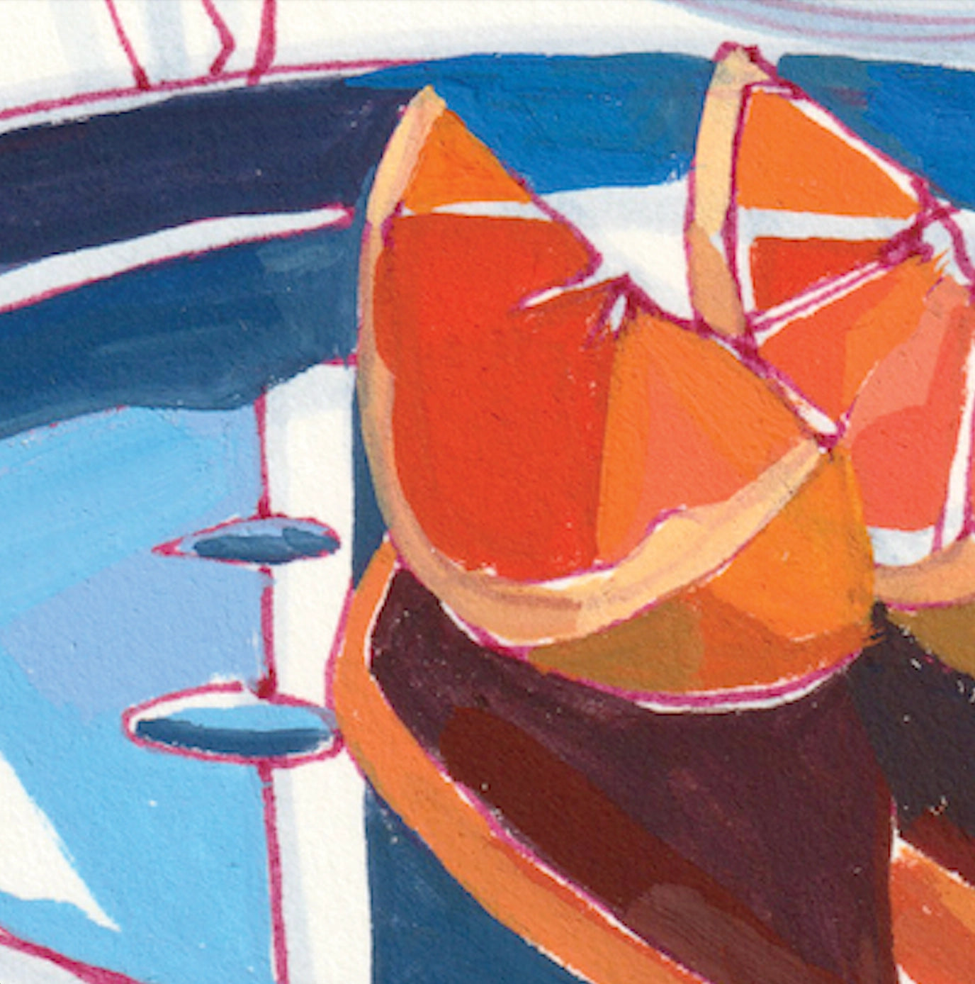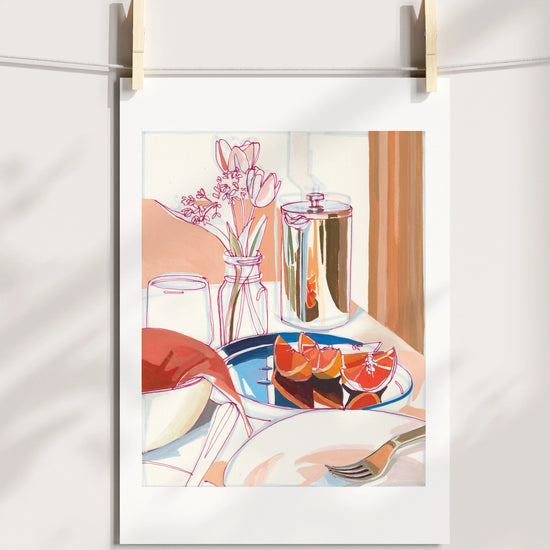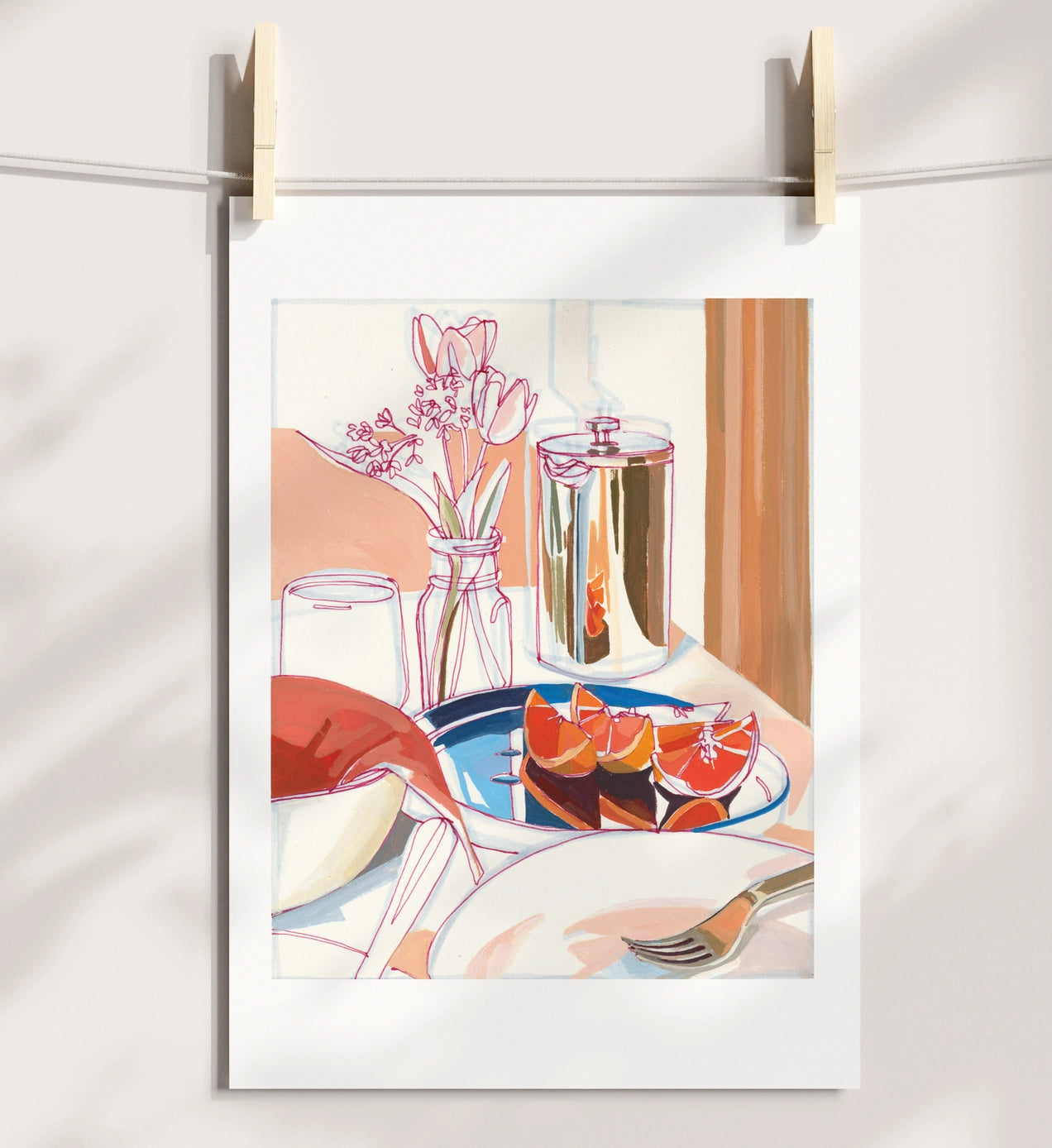 Who doesn't love an elegant breakfast? This vibrant gouache and pen painting by Anissa Riviere is transformed into a signed archival quality giclee print. This still life features a coffee french press, tulips, and orange slices. Inspired by an early breakfast in the Catskills in Upstate New York, high quality pigment inks bring this image to life. This fruit and floral wall art print would look fabulous above a bar cart, on the kitchen wall, or gallery wall!