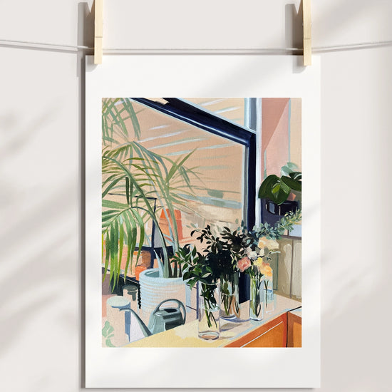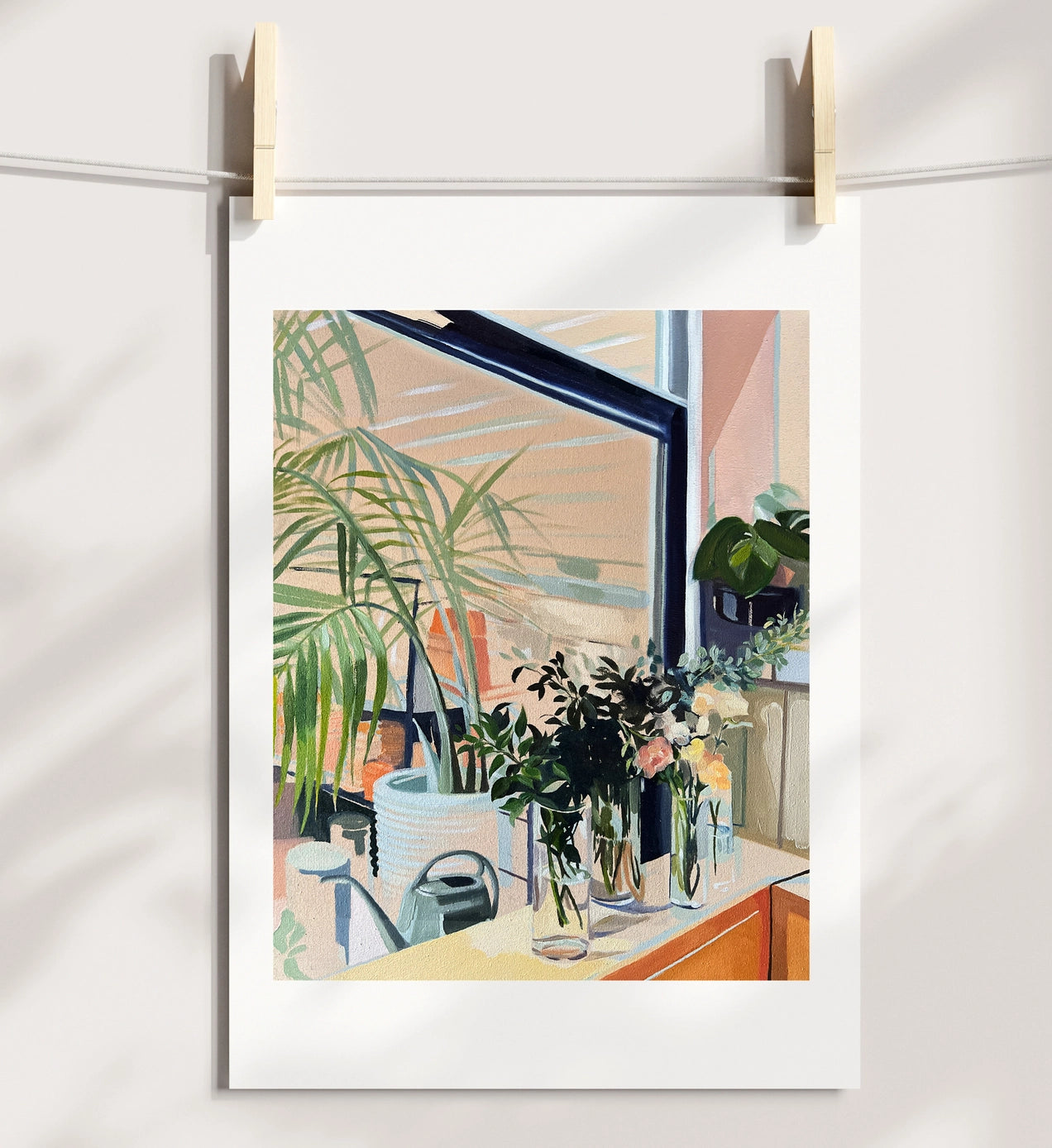 This vibrant oil painting by Anissa Riviere is transformed into a signed archival quality giclee print. This still life features vases of roses and eucalyptus, house plants, and a potted palm tree. Inspired by a peaceful Brooklyn plant shop, high quality pigment inks bring this calming image to life.