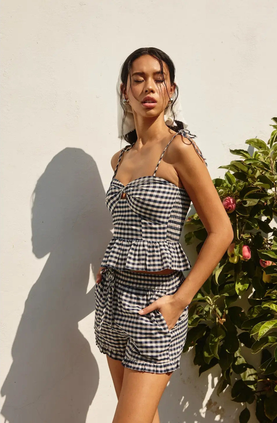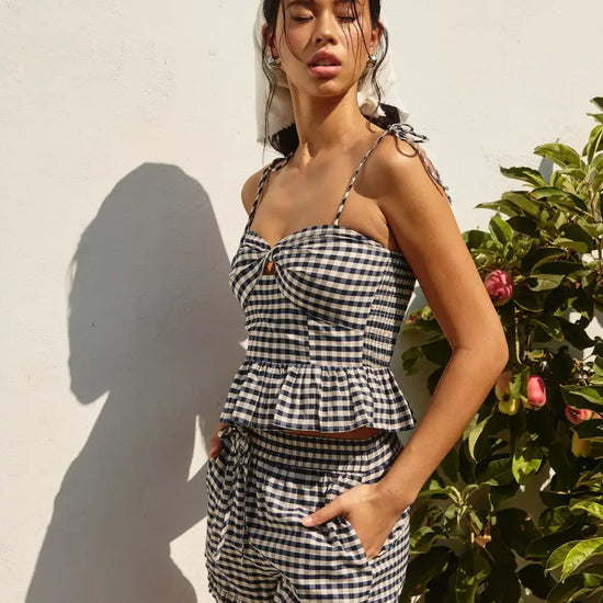 Brunch Date Top – A charming gingham print top designed for effortless style and a touch of flirtiness. Featuring a sweetheart neckline, twist knot detail, and a subtle cutout at the bust, this top is perfect for warm-weather adventures. The smocked waist ensures a flattering fit, while the ruffle hem and adjustable tie shoulders add a playful, feminine touch.