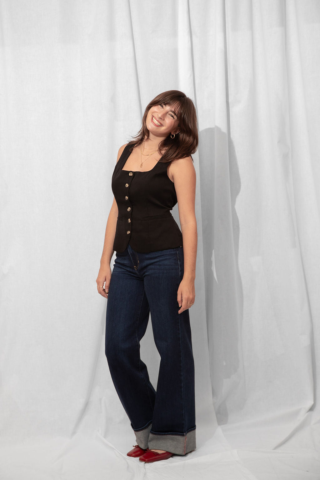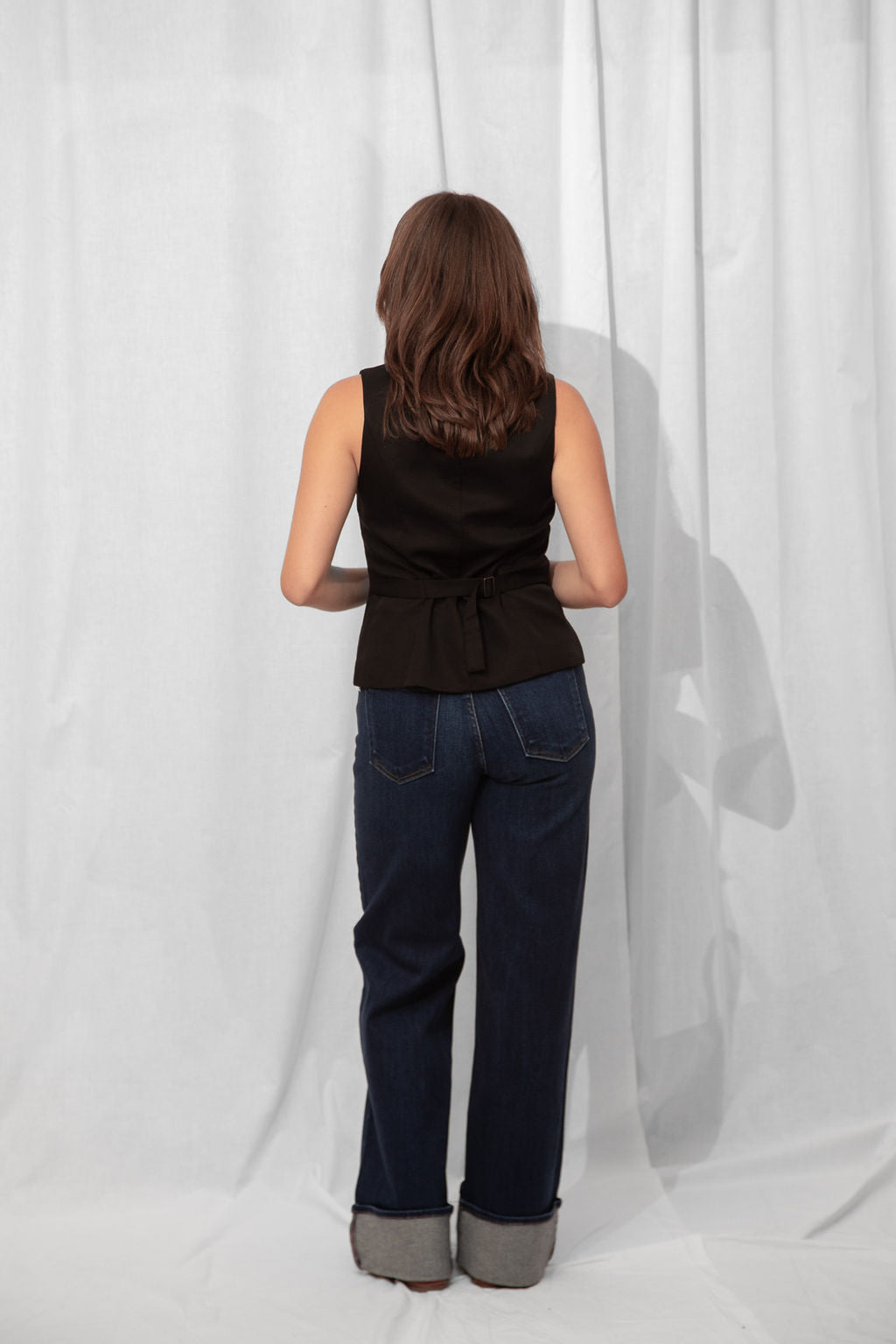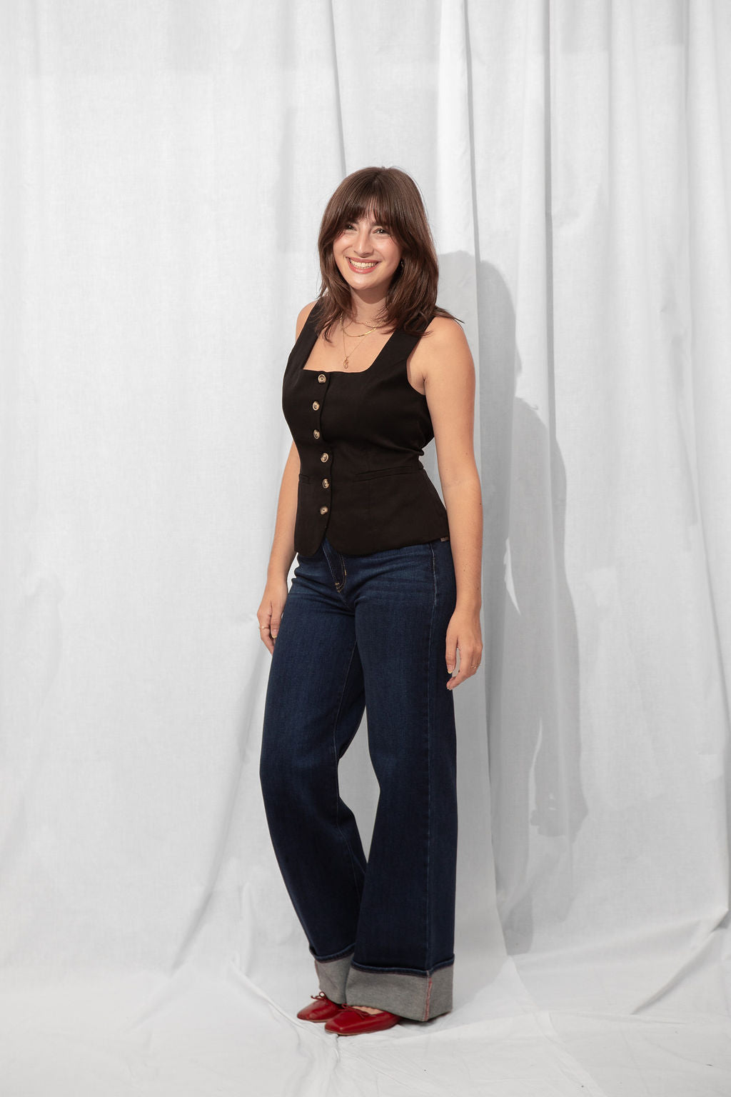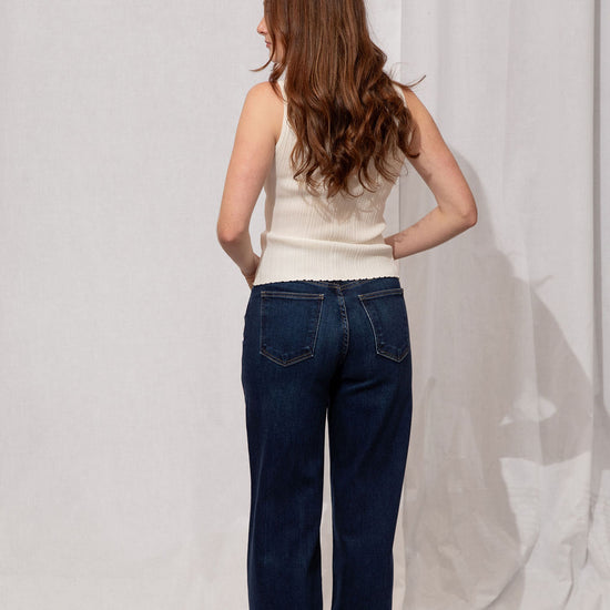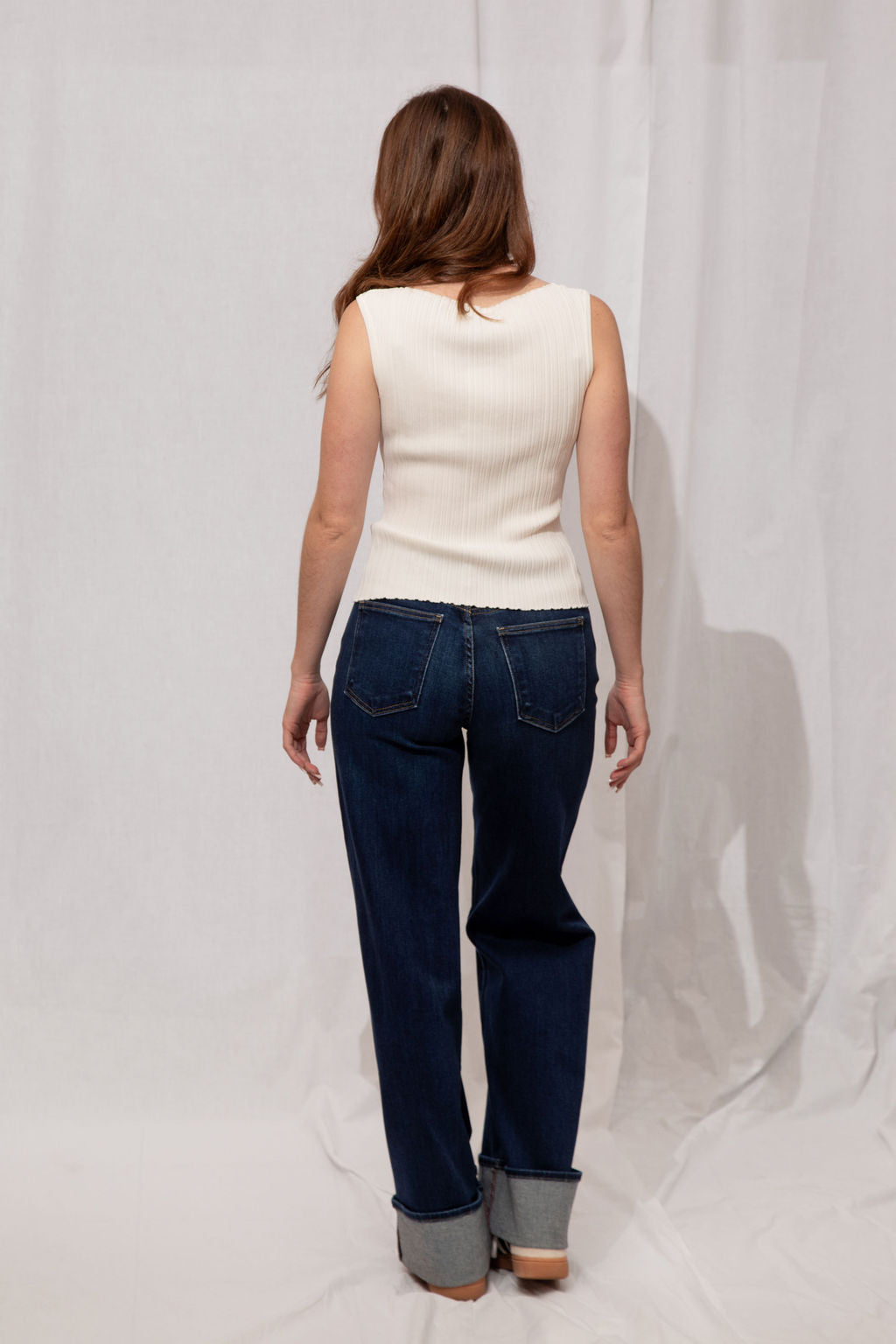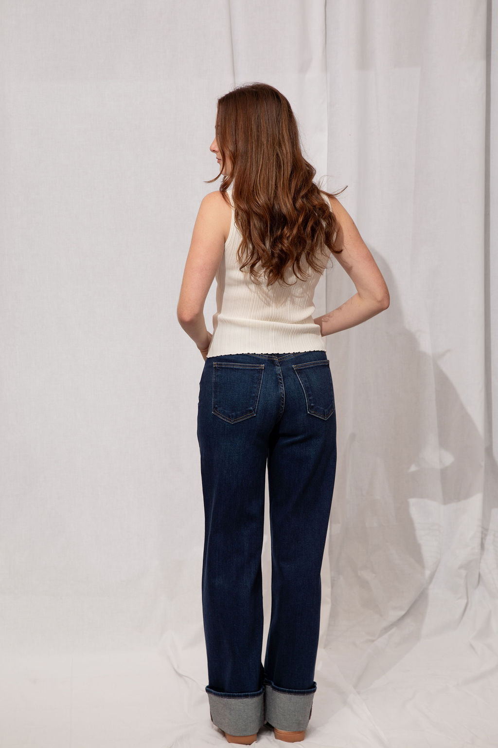 For the Tall girls- Nicole is wearing the Dark Denim with the cuff fully dropped. Drop the cuff for a full length long pant. *You can DIY or ask us for about our partnership with Dearborne Denim for the perfect customized length for only $5!