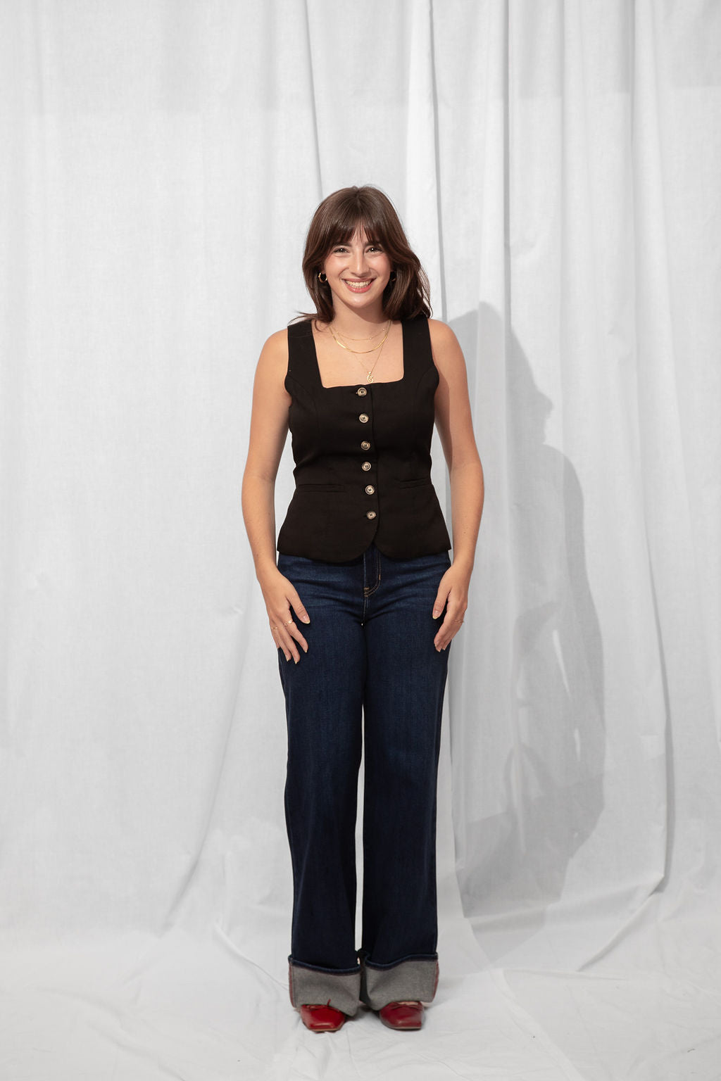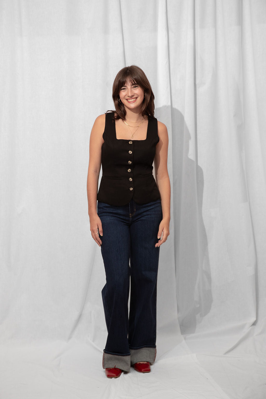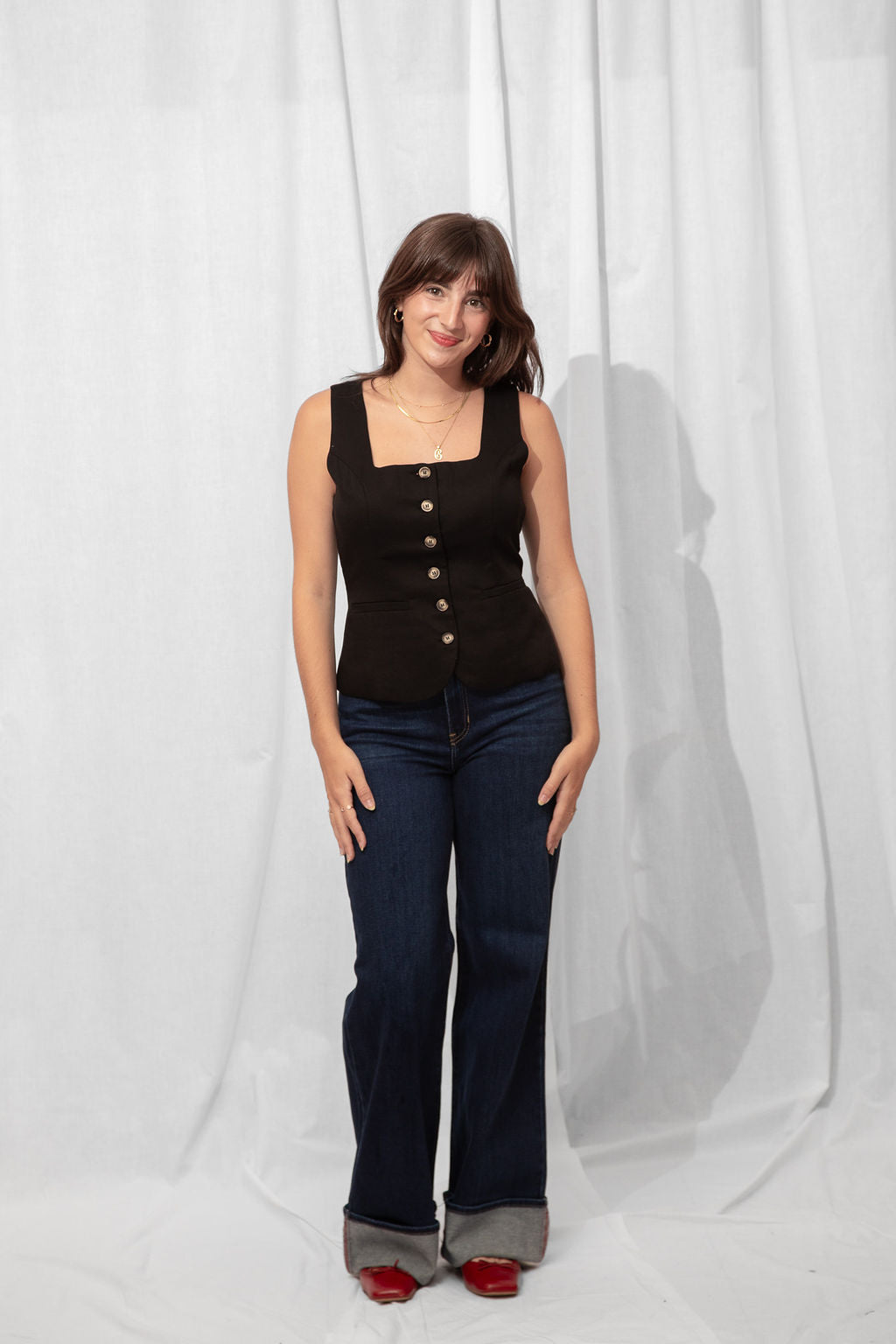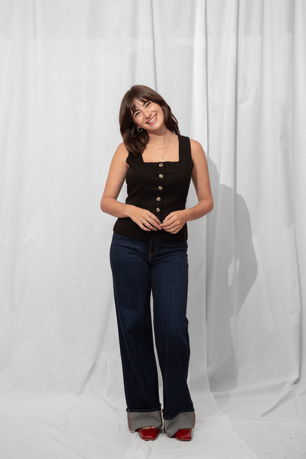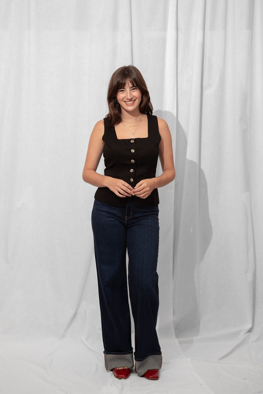 For the Tall girls- Nicole is wearing the Dark Denim with the cuff fully dropped. Drop the cuff for a full length long pant. *You can DIY or ask us for about our partnership with Dearborne Denim for the perfect customized length for only $5!