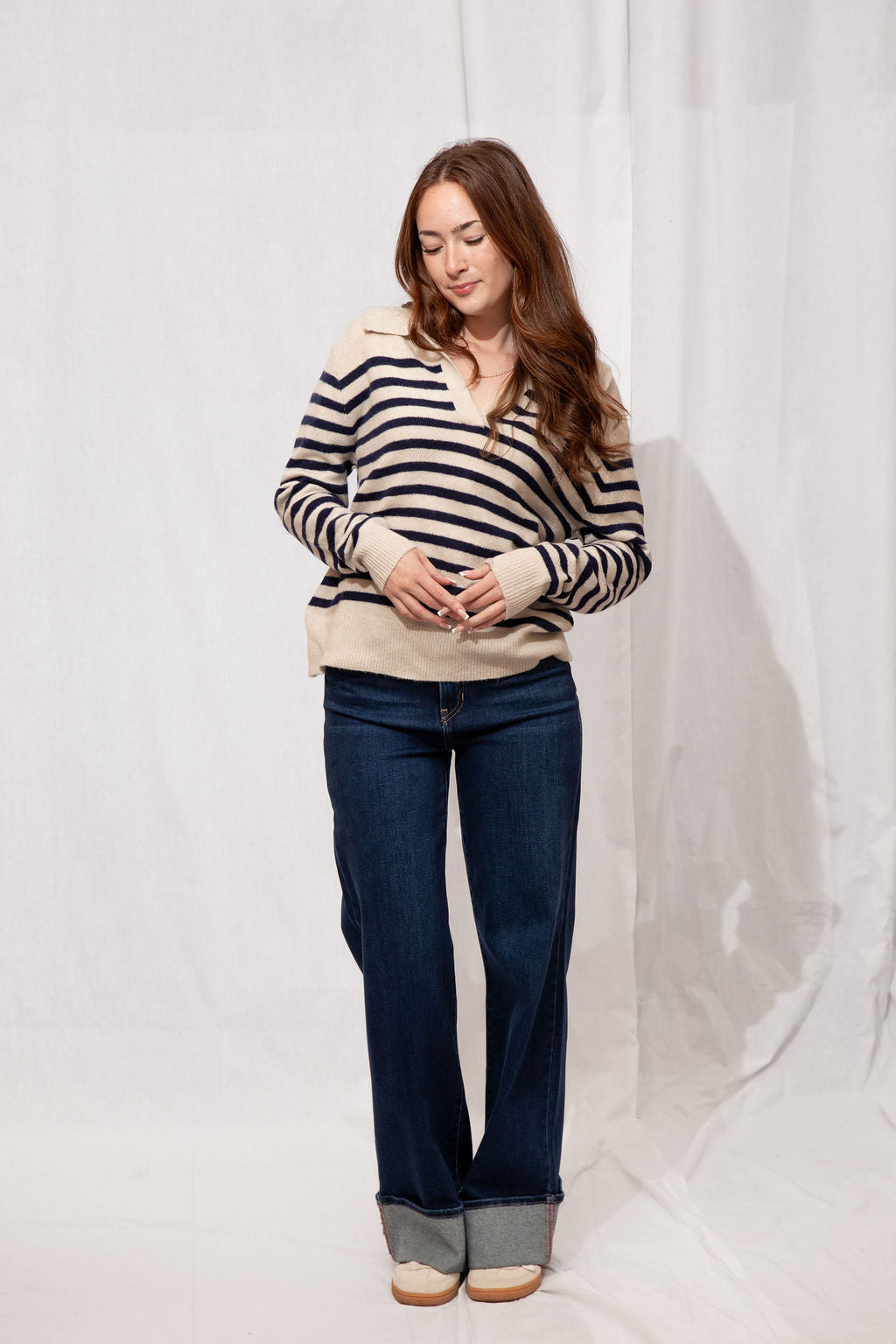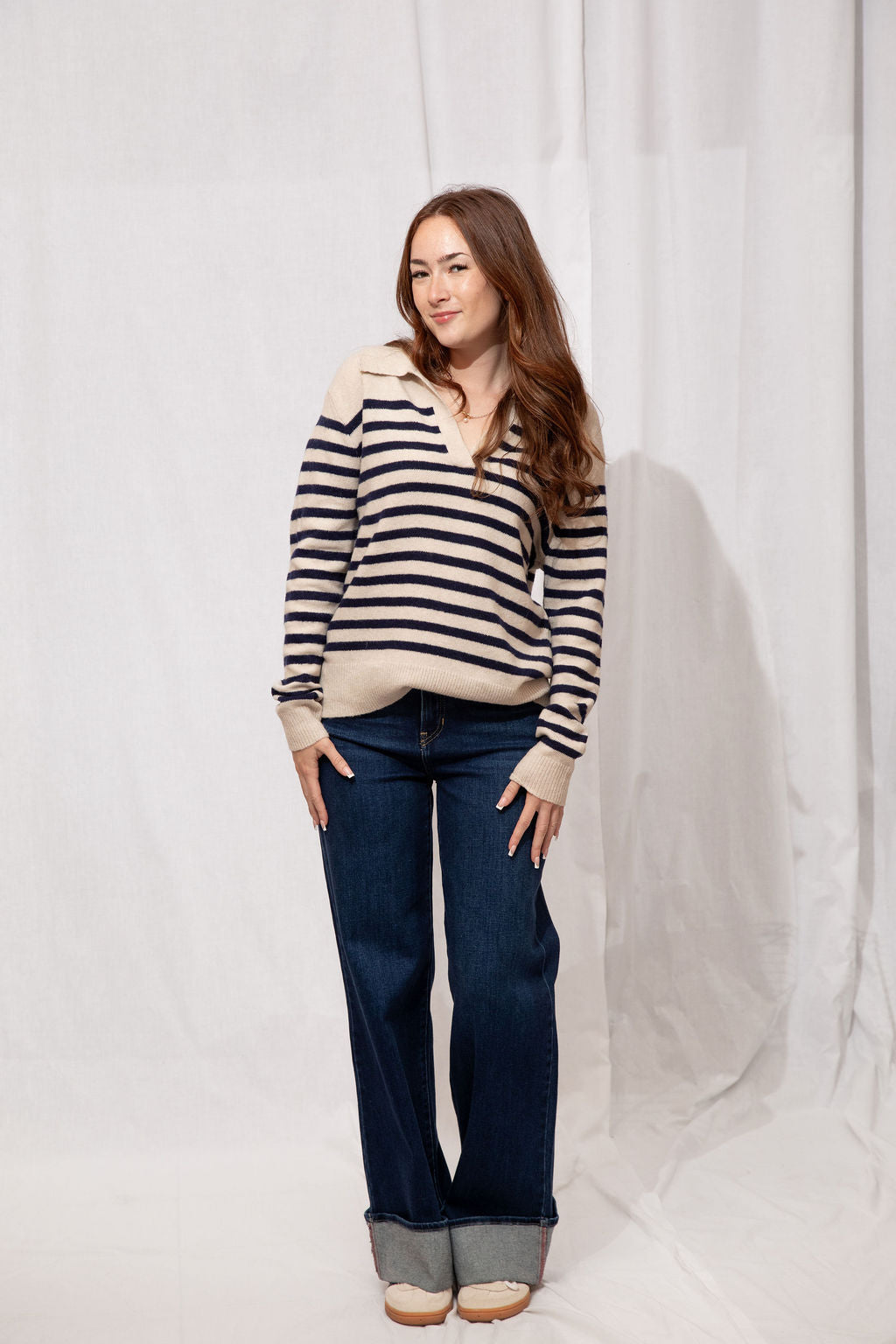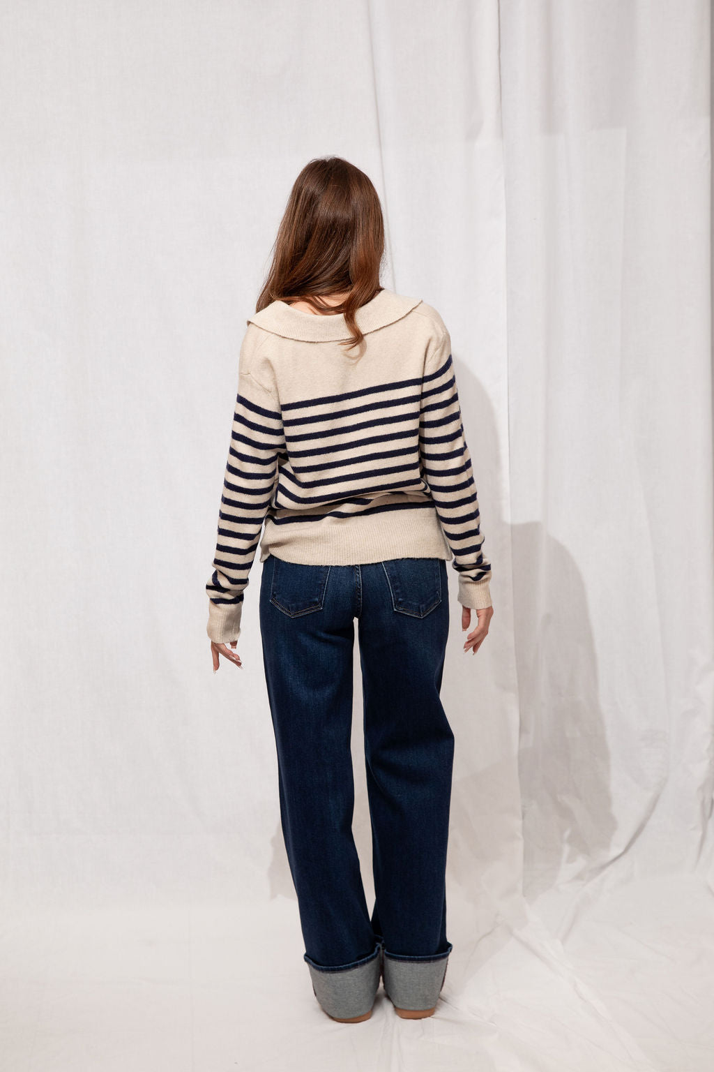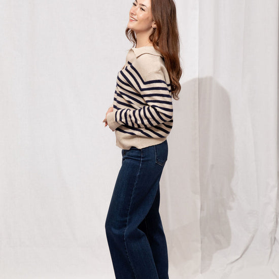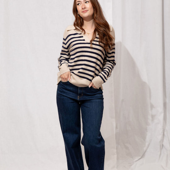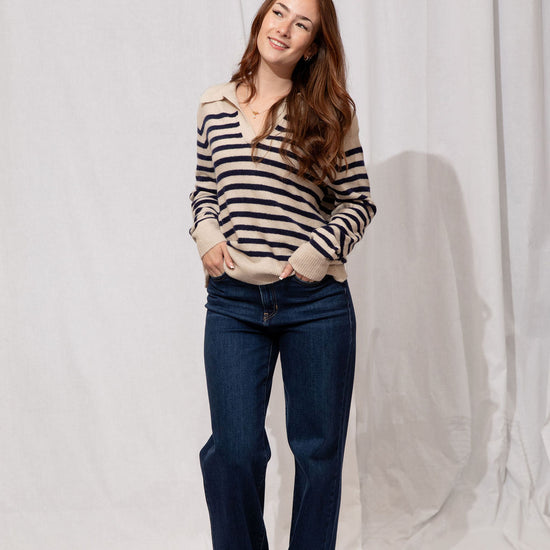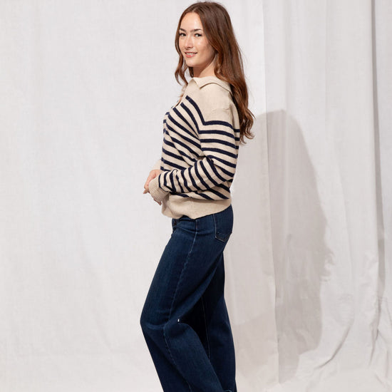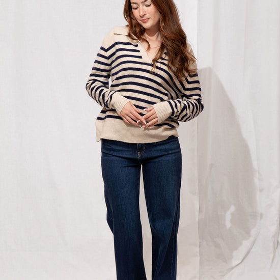 Think preppy with a cozy twist! The Easton Sweater is your go-to for a polished yet comfy look. Featuring a classic polo collar, soft striped detailing, and a subtle fuzzy texture, it’s perfect for layering over skirts, jeans, or your favorite trousers. Ribbed trims and a tapered fit keep it flattering and easy to style—whether you’re running errands, meeting friends for coffee, or just lounging in style.