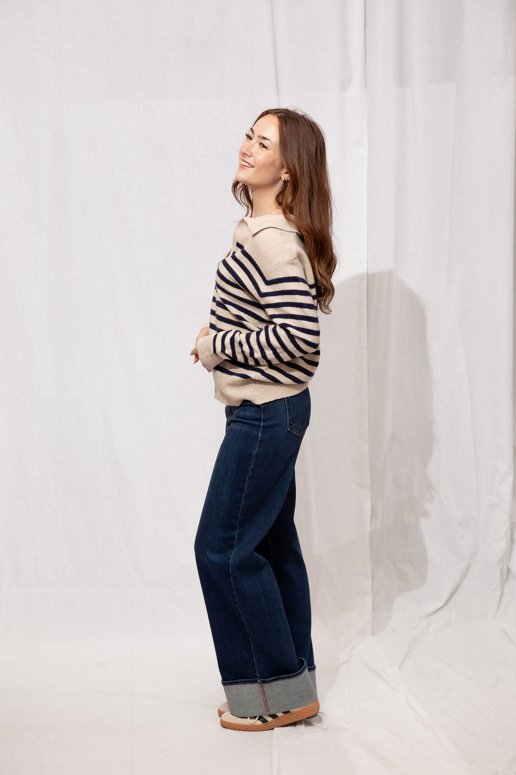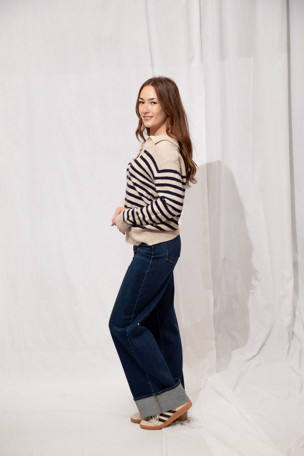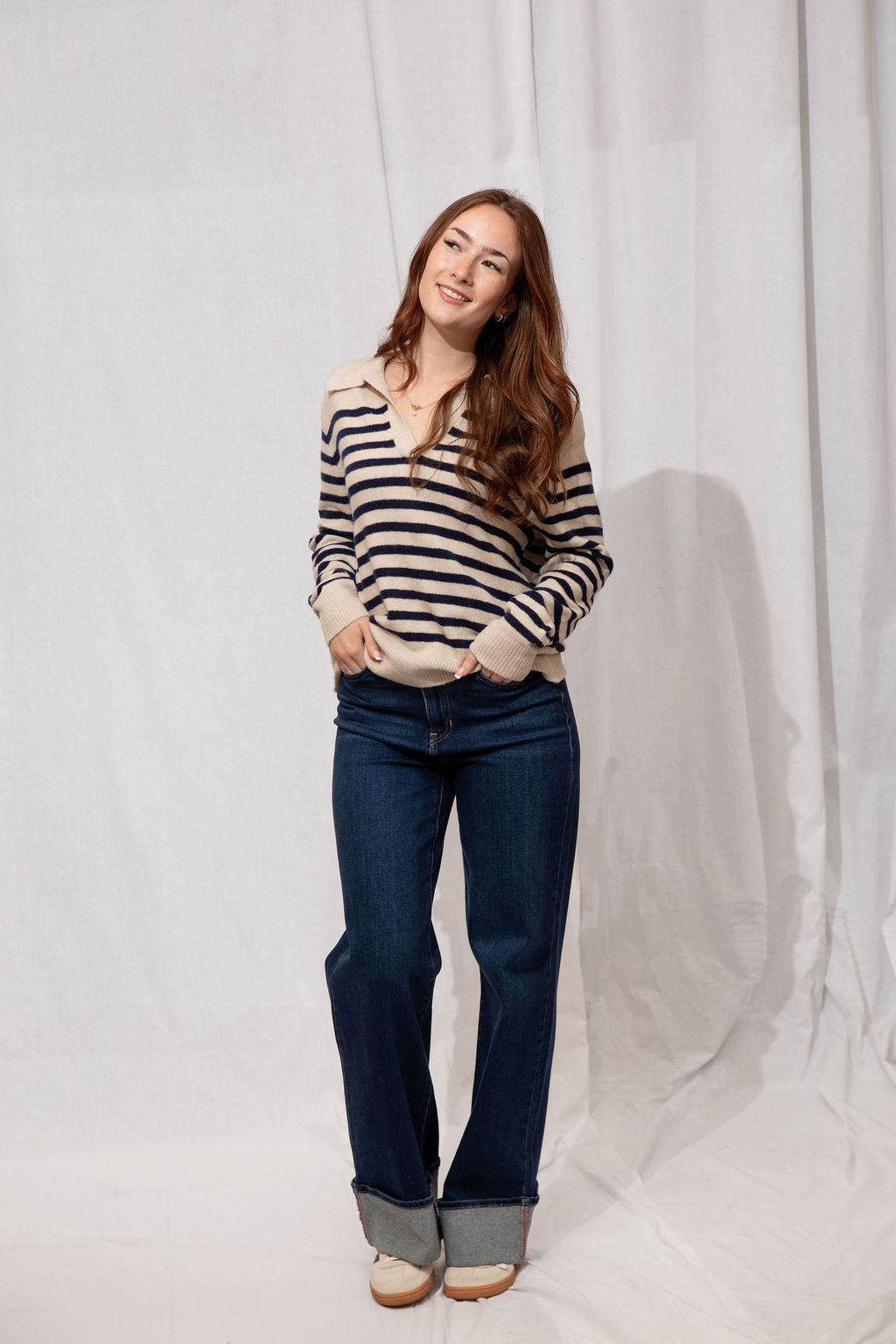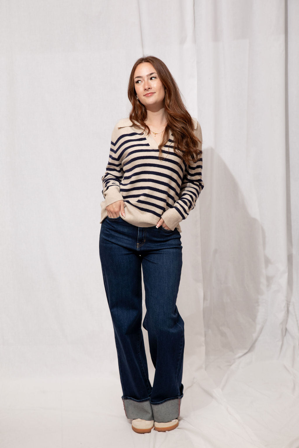 Think preppy with a cozy twist! The Easton Sweater is your go-to for a polished yet comfy look. Featuring a classic polo collar, soft striped detailing, and a subtle fuzzy texture, it’s perfect for layering over skirts, jeans, or your favorite trousers. Ribbed trims and a tapered fit keep it flattering and easy to style—whether you’re running errands, meeting friends for coffee, or just lounging in style.