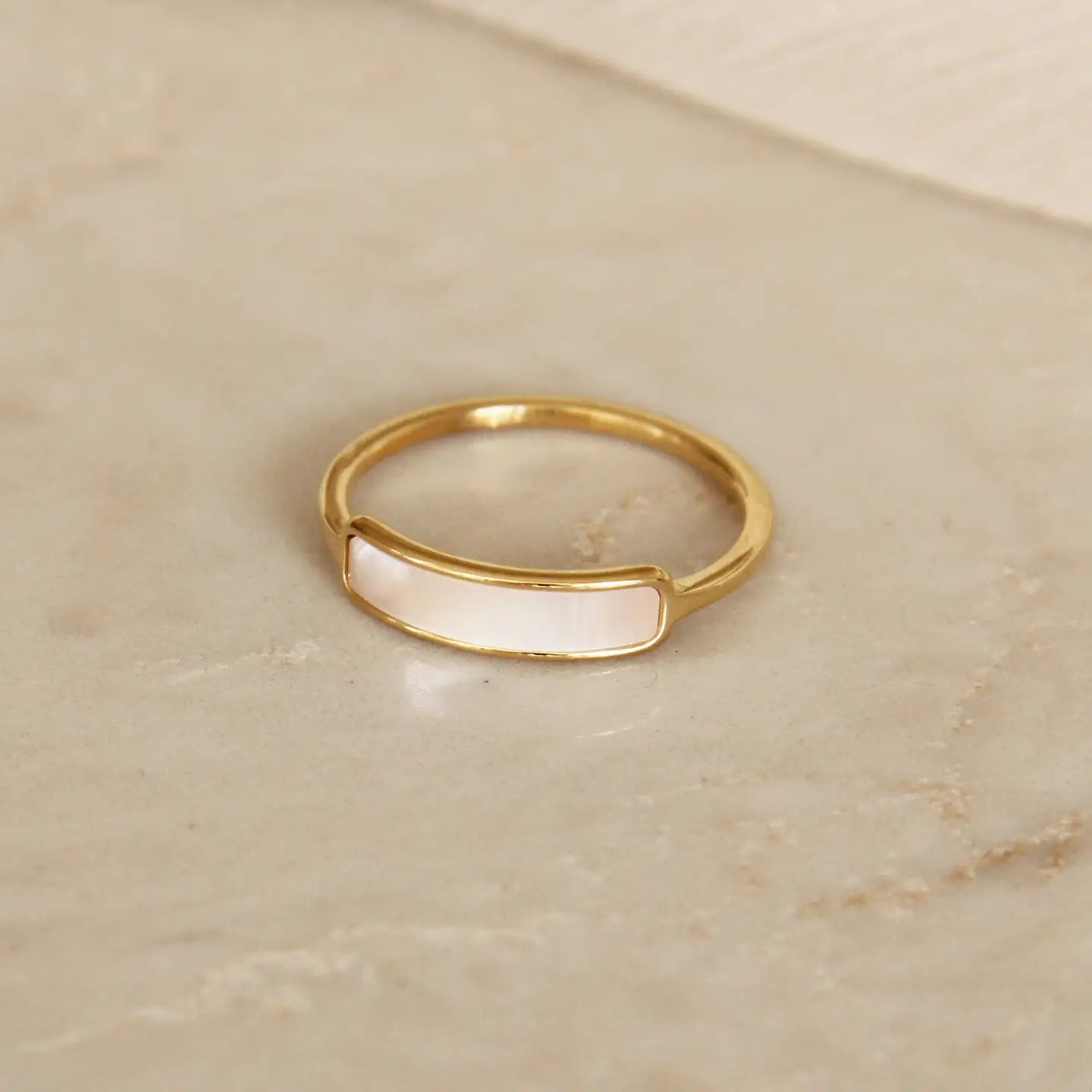 Channel your inner sea goddess with the Cove Ring, a luminous bar ring crafted with genuine mother of pearl. The iridescent glow of the shell catches the light like sun dancing on the ocean, making every ring uniquely one of a kind. Simple yet striking, it’s the perfect piece for layering with your favorites or wearing solo as a coastal-chic statement.🌊✨