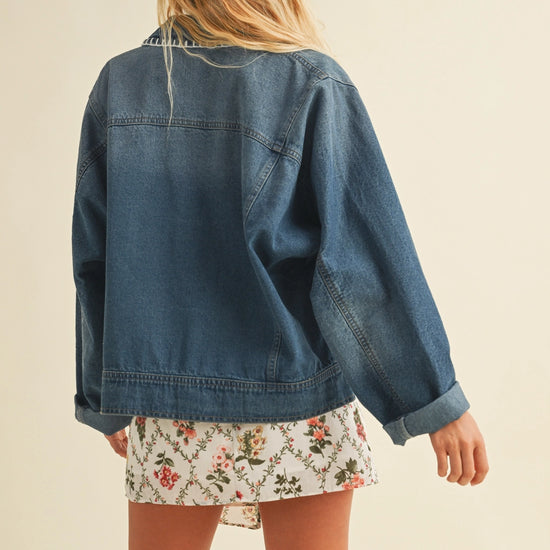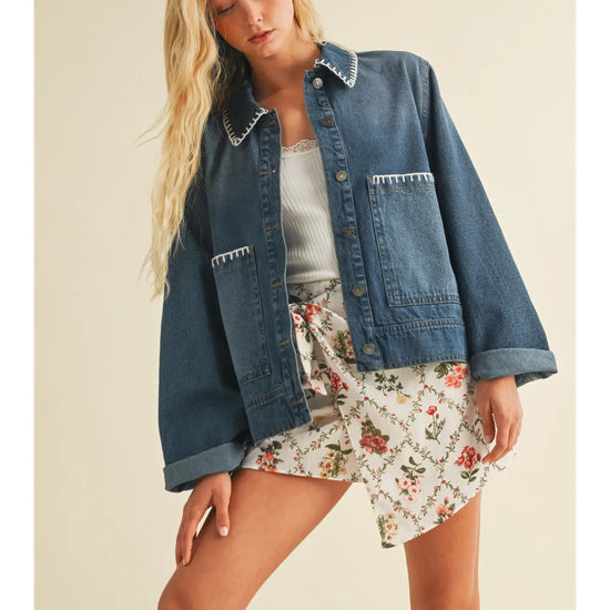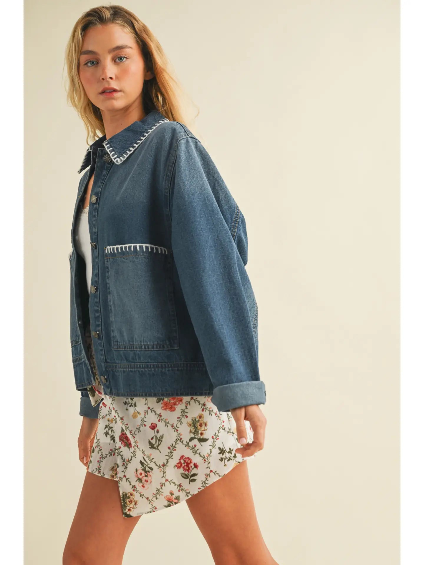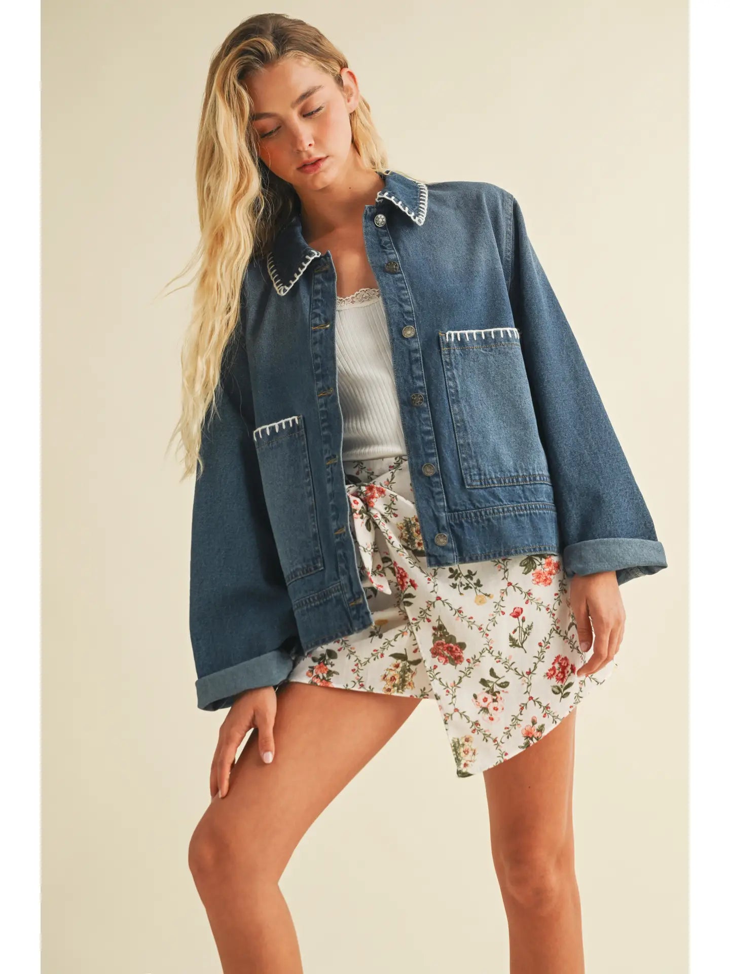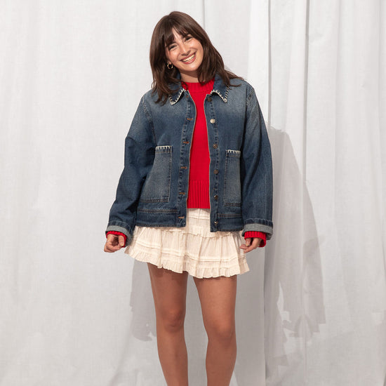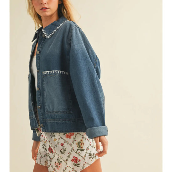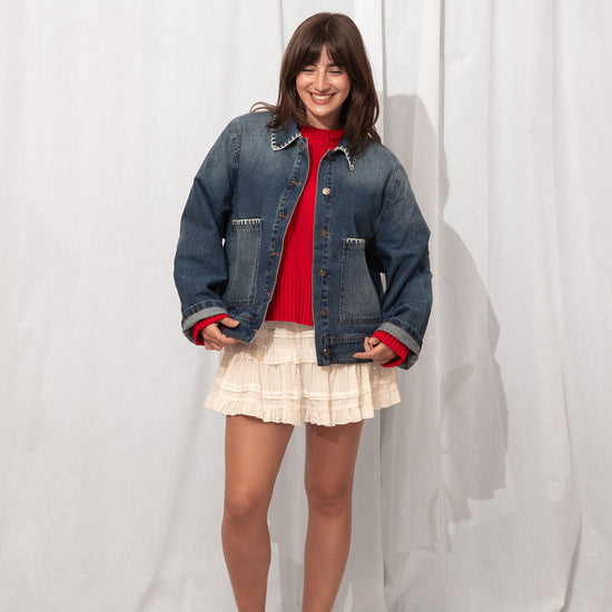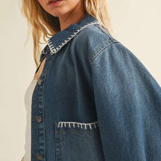 The Hazel is your new everyday denim layer—with a twist. This oversized denim jacket features a standout blanket stitch in creamy thread for that little something extra. Think timeless meets artsy cool.🧵💙