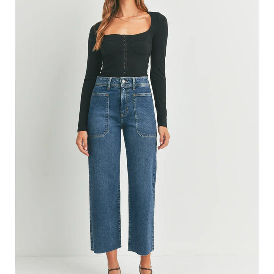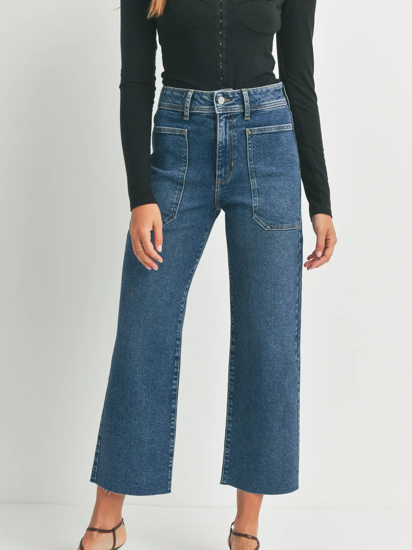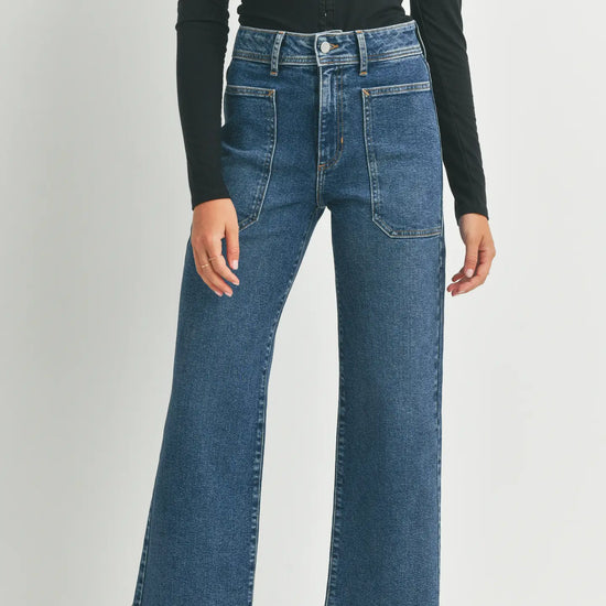 This super trendy wide-leg denim is your go-to for a chic yet effortless spring-summer look! Designed with a flattering high rise and utility-style front pockets, these jeans bring a modern, nautical-inspired edge to your wardrobe. The light wash denim and wide-leg silhouette create a relaxed yet polished vibe—perfect for pairing with anything from a classic tee to a structured blazer.