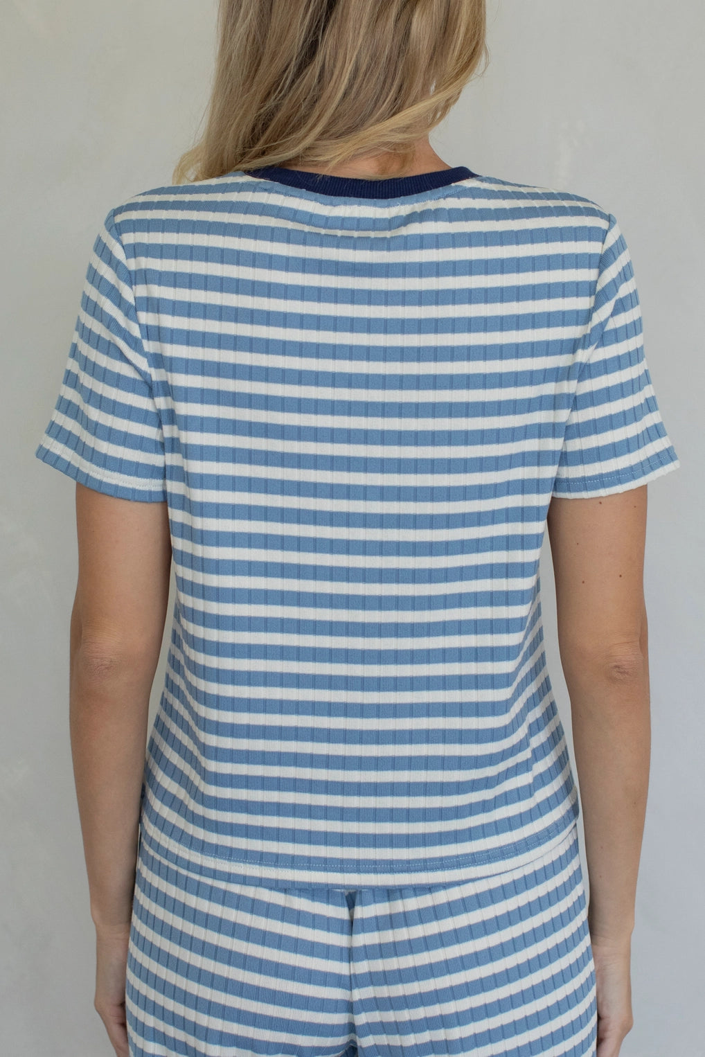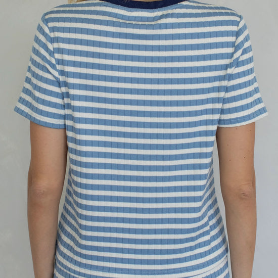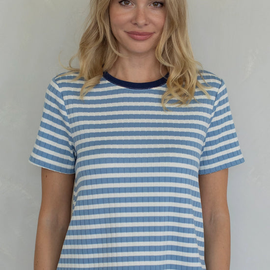 Meet your new everyday favorite—the James Tee. This comfy and soft striped top features classic blue and white stripes with a pop of contrast from the navy collar. Easy, cute, and effortlessly wearable, it’s the go-to you’ll keep reaching for whether you’re running errands, grabbing coffee, or lounging around.