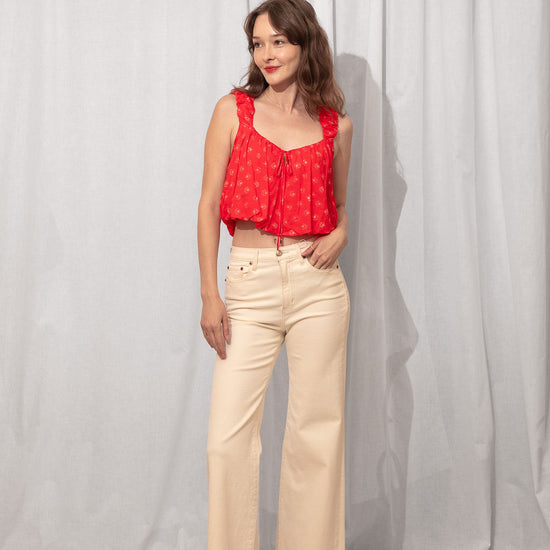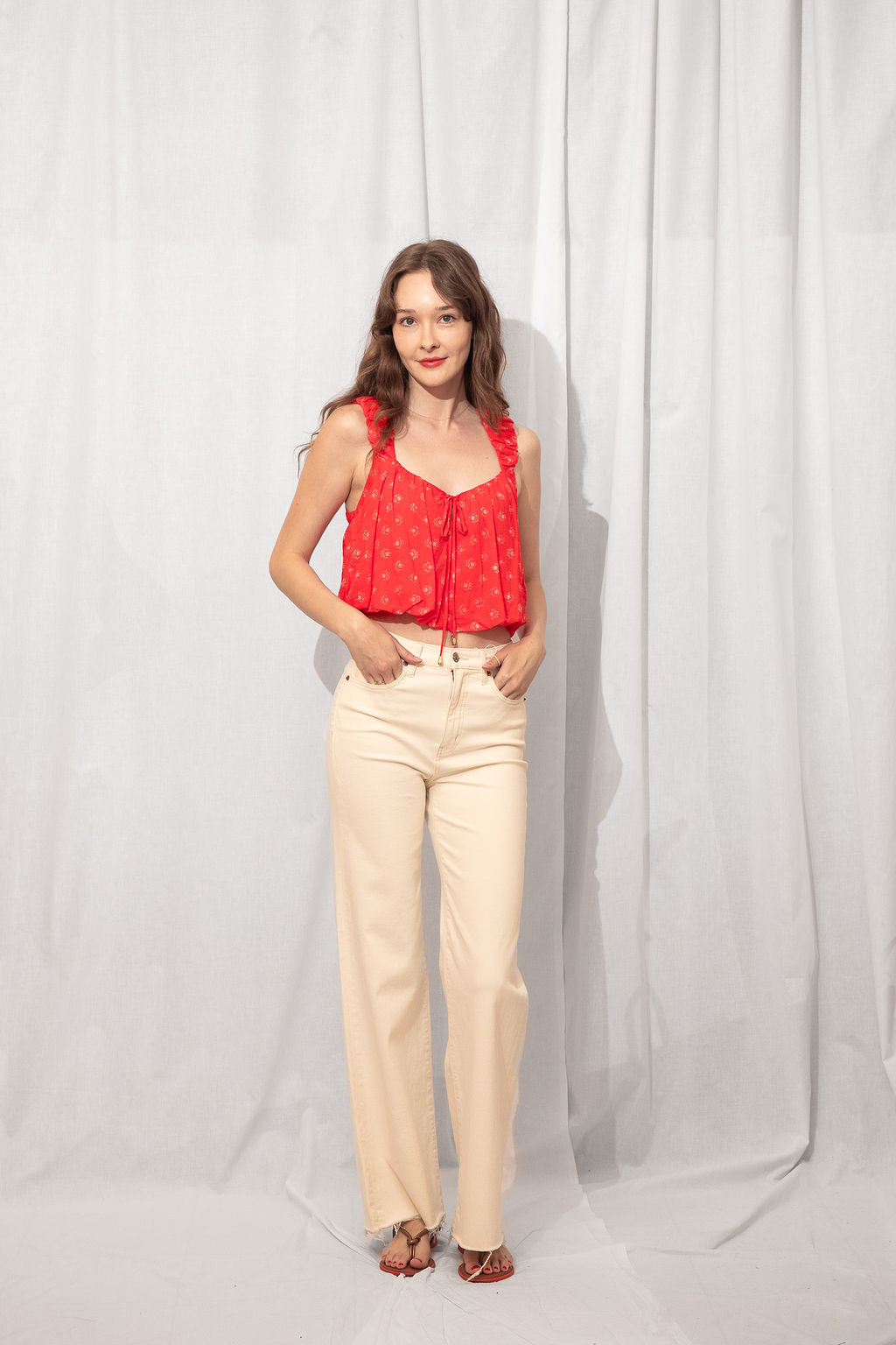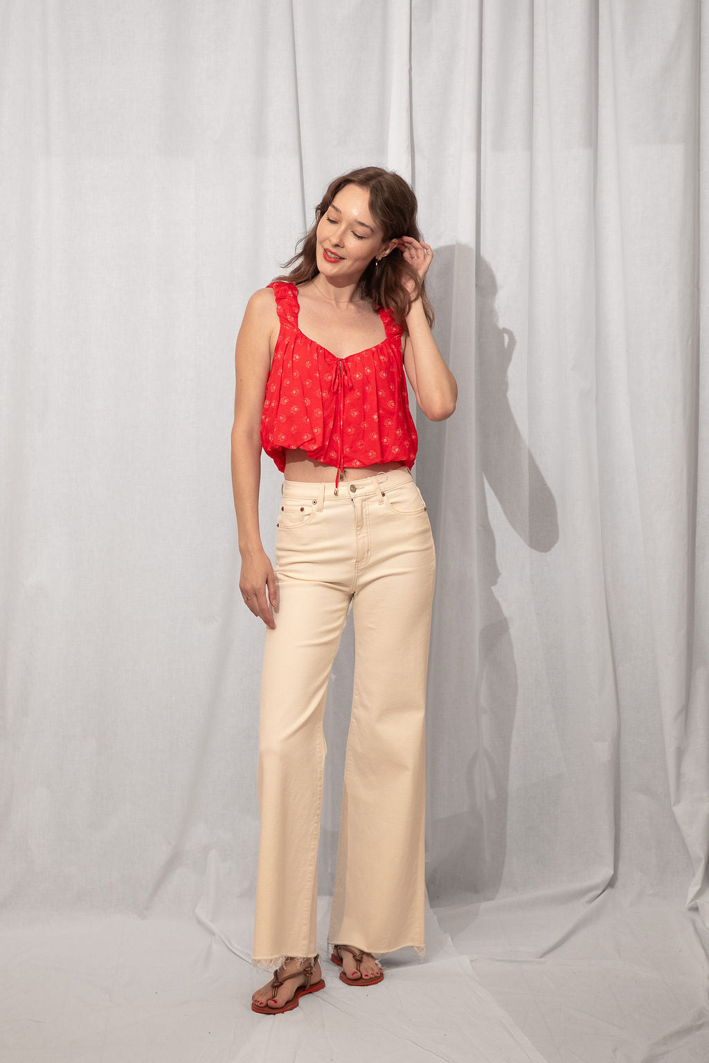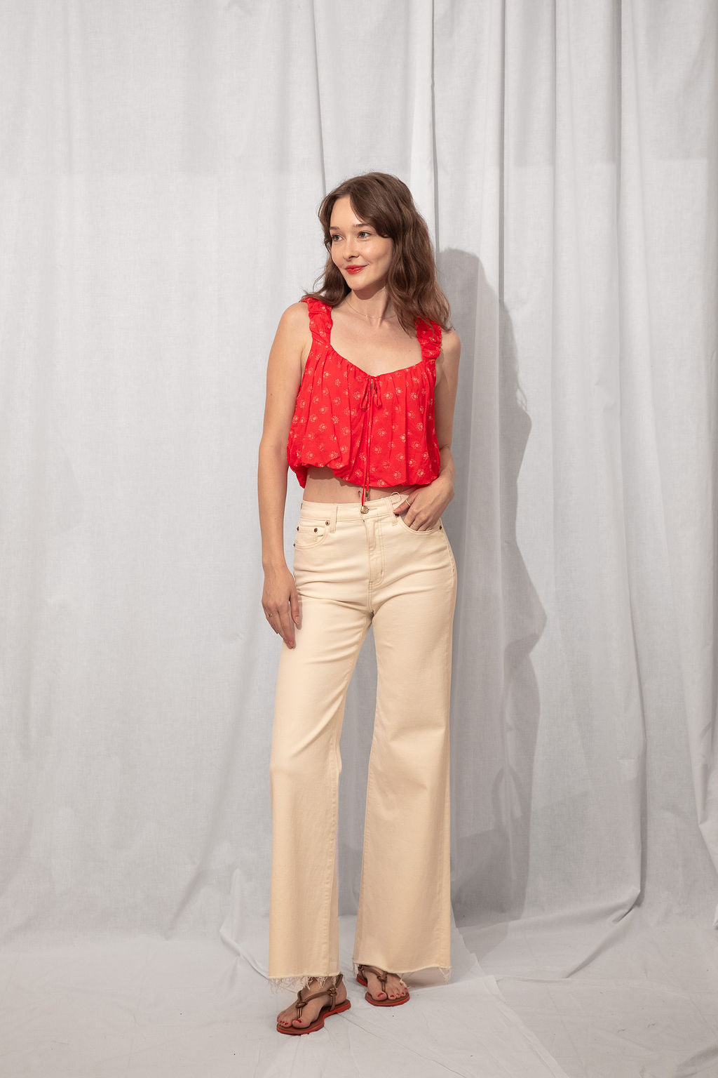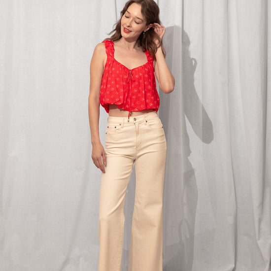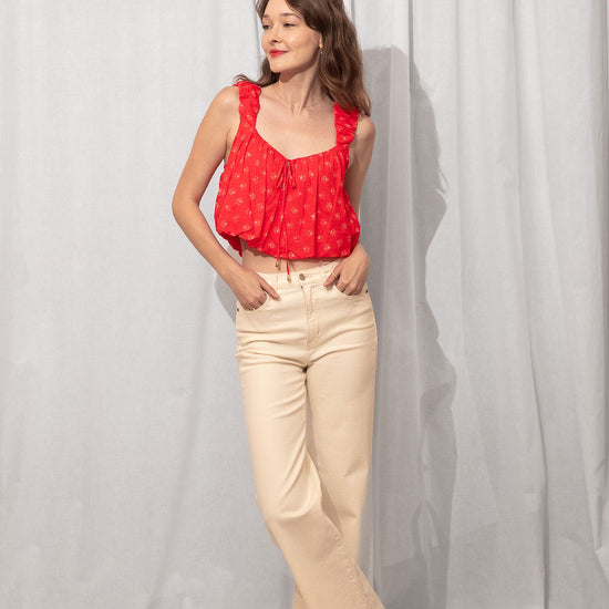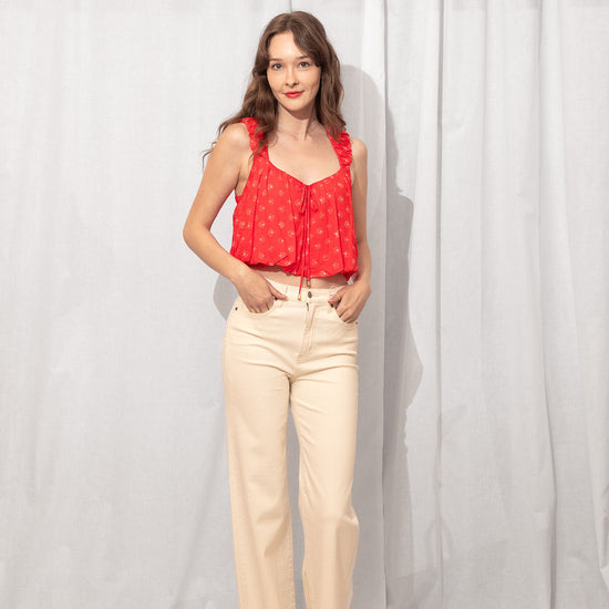 The cutest little crop for sunny days ahead. The Krista Top features a playful red-coral hue with a charming print detail, square neckline, and a sweet front tie with a flirty v-slit. The bubble hem adds that just-right volume—perfect with high-waisted denim or a breezy skirt.🍓