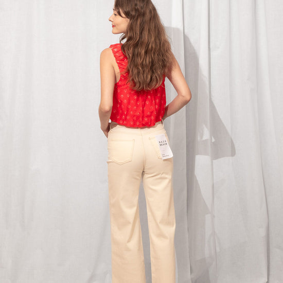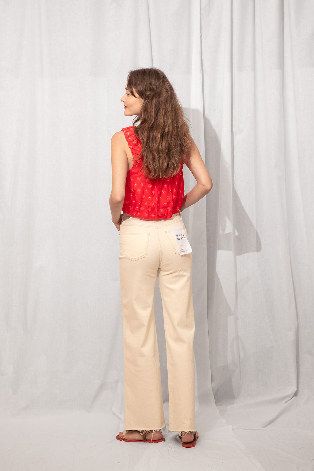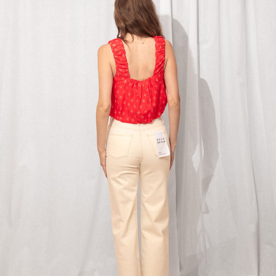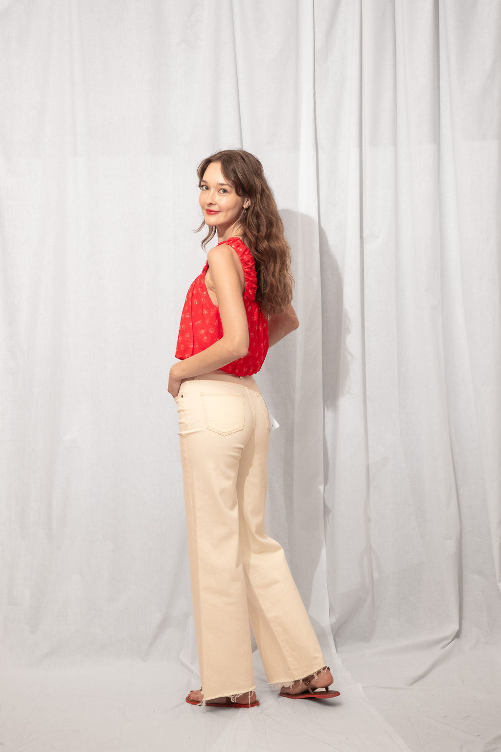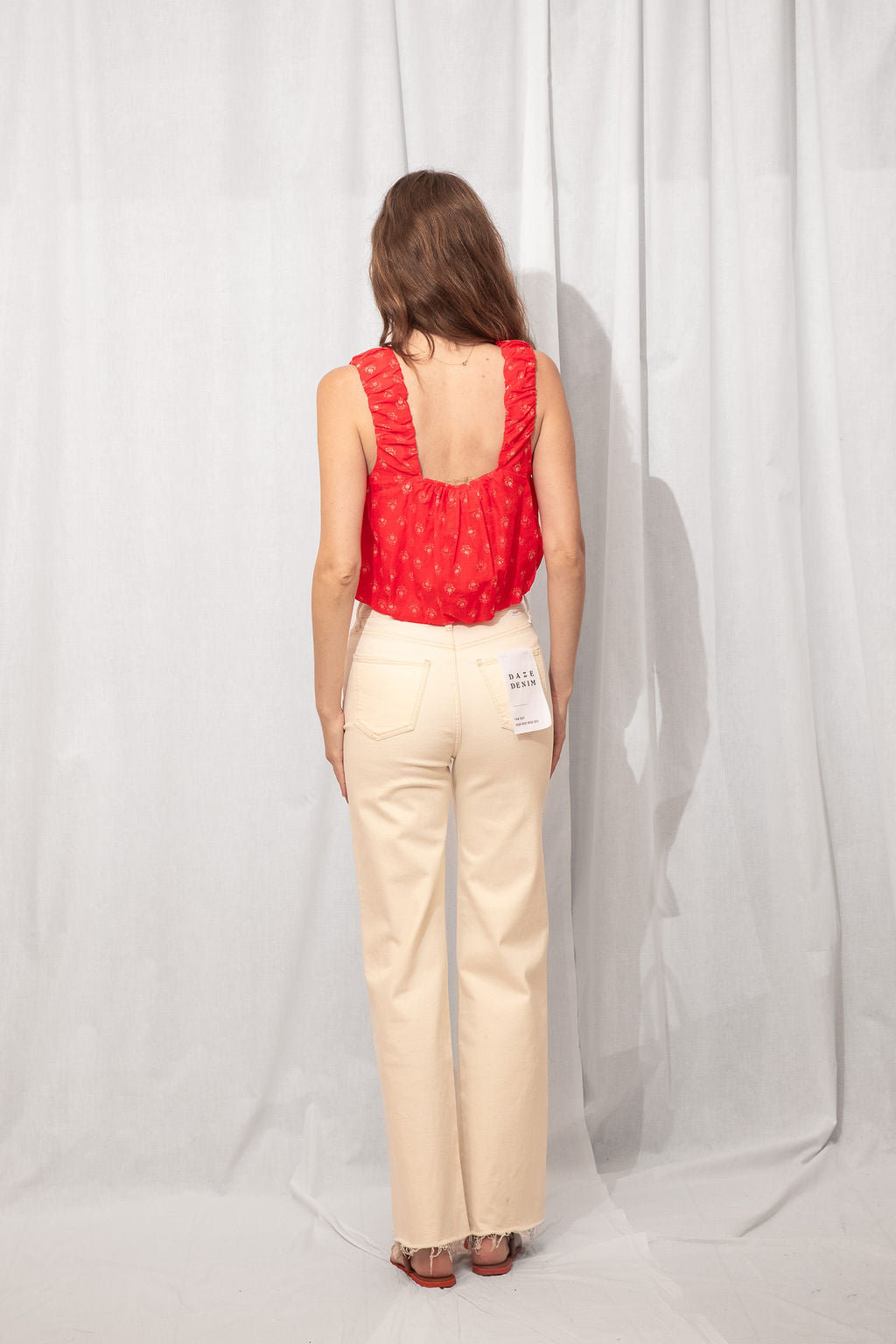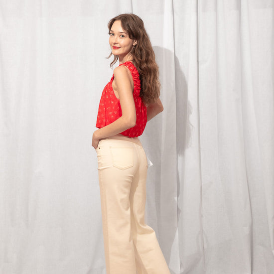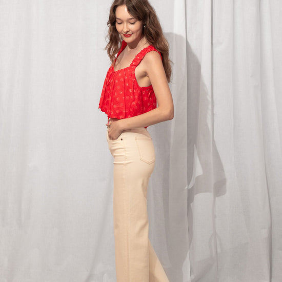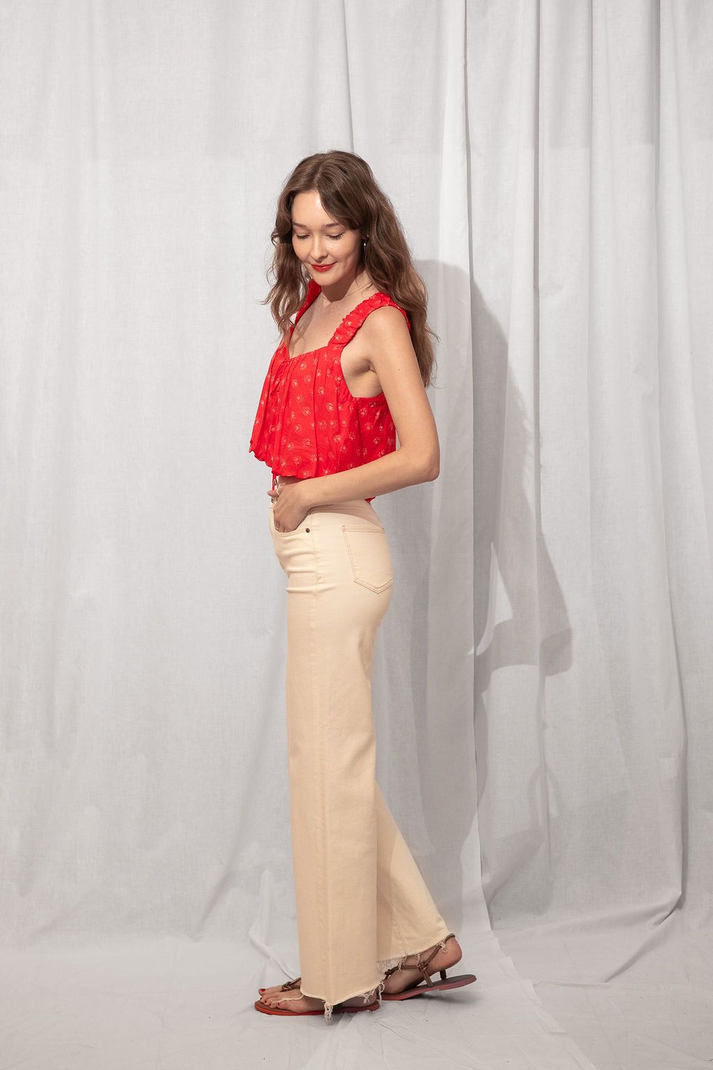 The cutest little crop for sunny days ahead. The Krista Top features a playful red-coral hue with a charming print detail, square neckline, and a sweet front tie with a flirty v-slit. The bubble hem adds that just-right volume—perfect with high-waisted denim or a breezy skirt.🍓