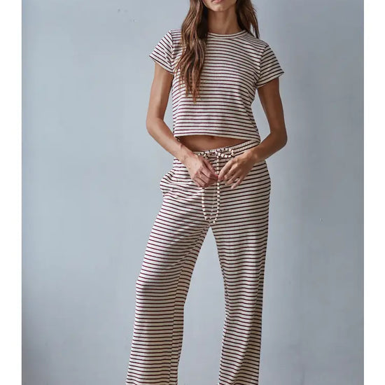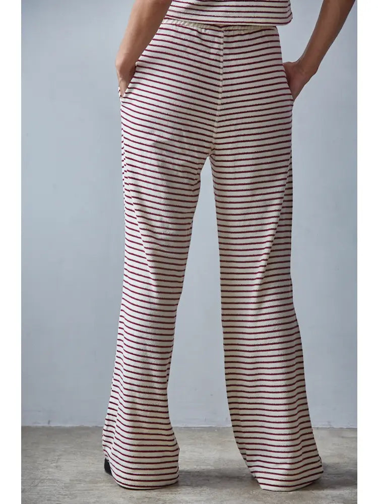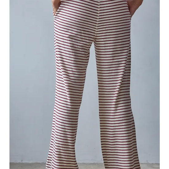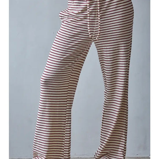 These cream lounge pants with a playful burgundy stripe are your new all-season cozy companion. Crafted from a soft polyester-cotton blend, their knit fabric feels deliciously snug, while the flare cut and waist tie add a fun, flattering twist. Side pockets keep essentials close, making relaxation or casual outings effortless. Once you slip these on, youβll want to live in them every day!