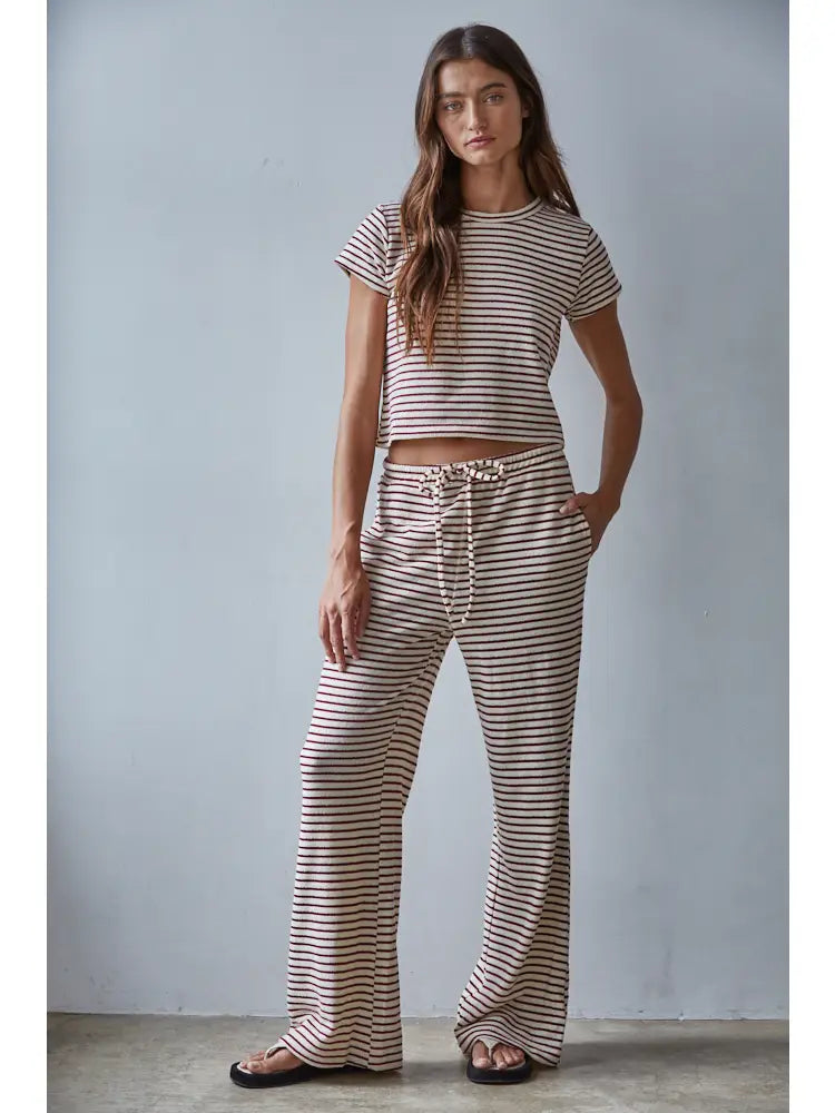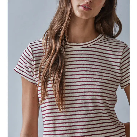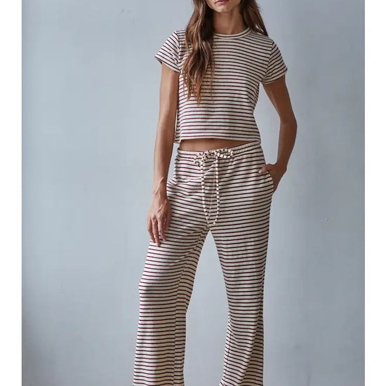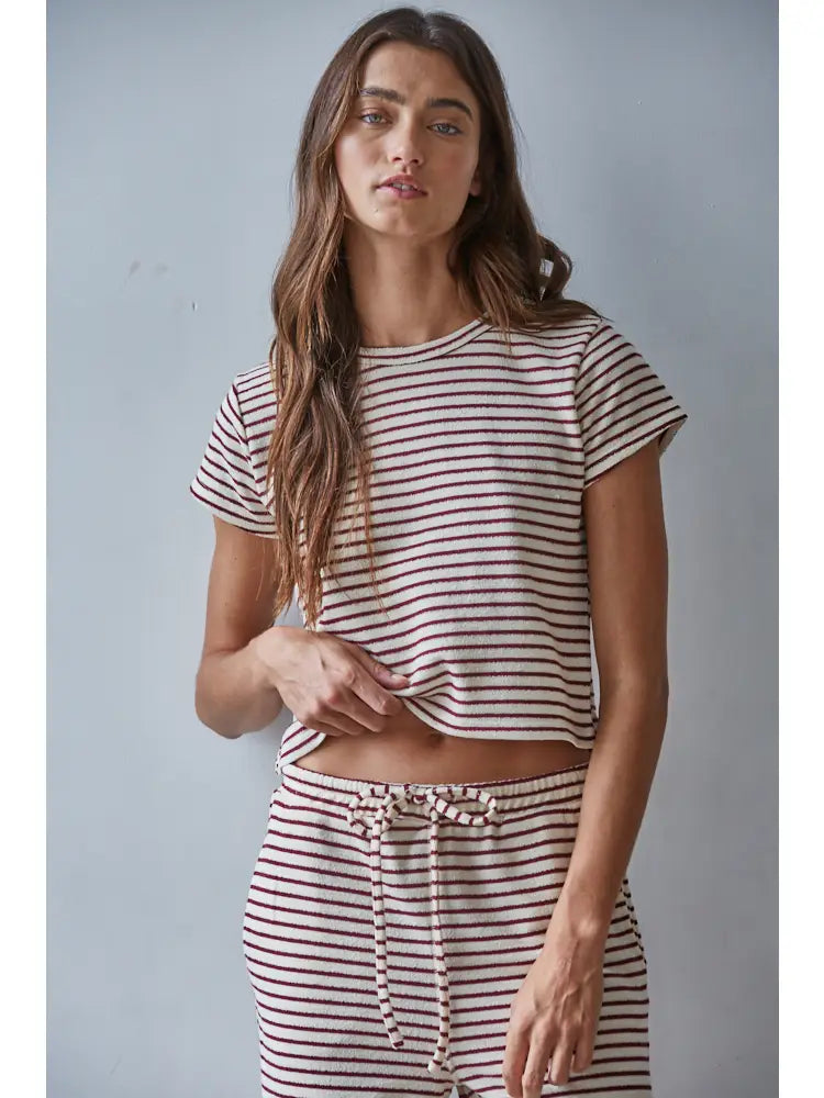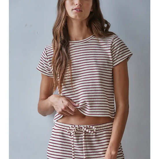 The Maple Tee brings playful charm with its cream and burgundy stripes, perfect for pairing with maple lounge pants or your favorite denim. This cozy, all-season knit top features a soft blend of 77% polyester and 23% cotton, making it an easy go-to for casual days. Its round neck and short sleeves add to the laid-back vibe you'll love wearing everywhere.