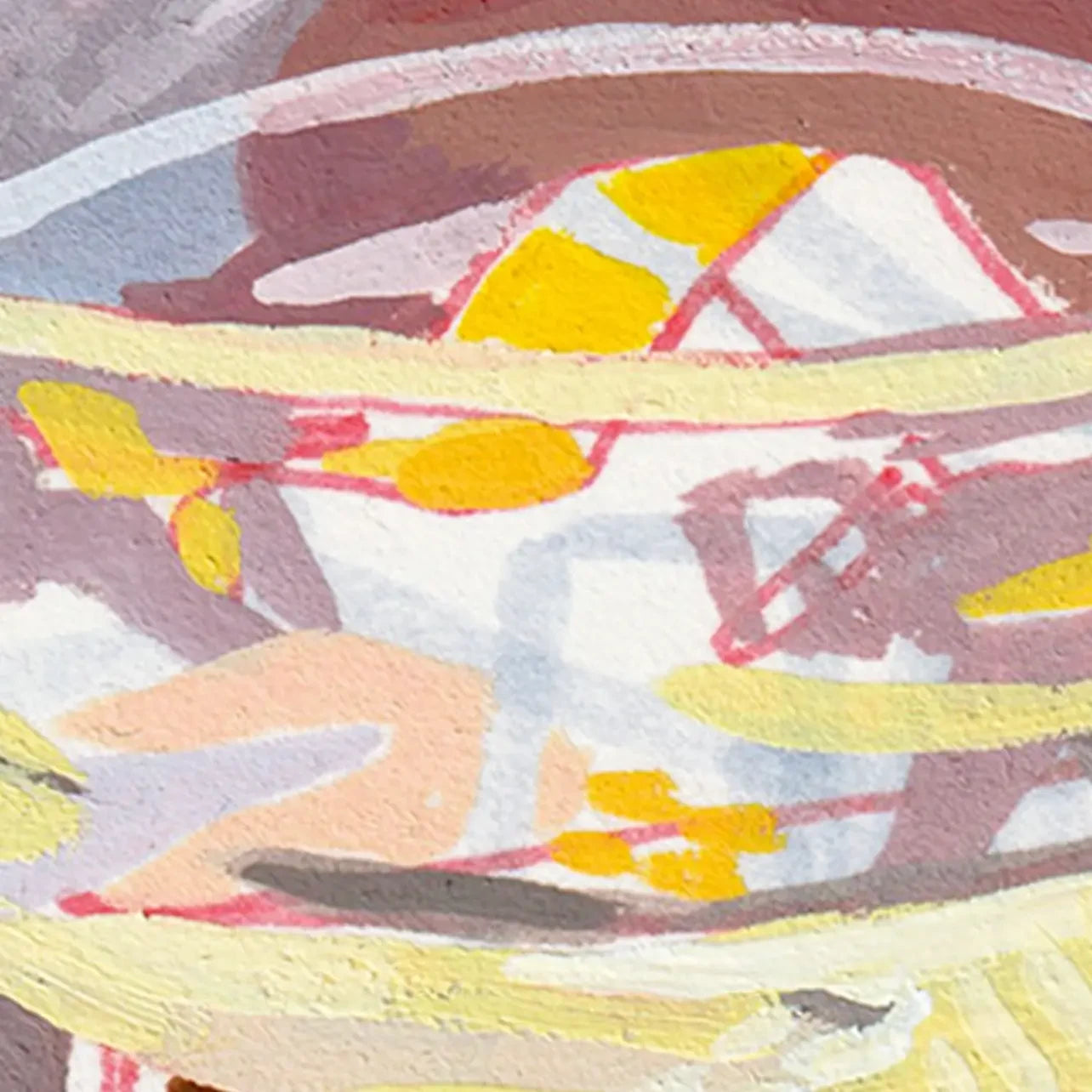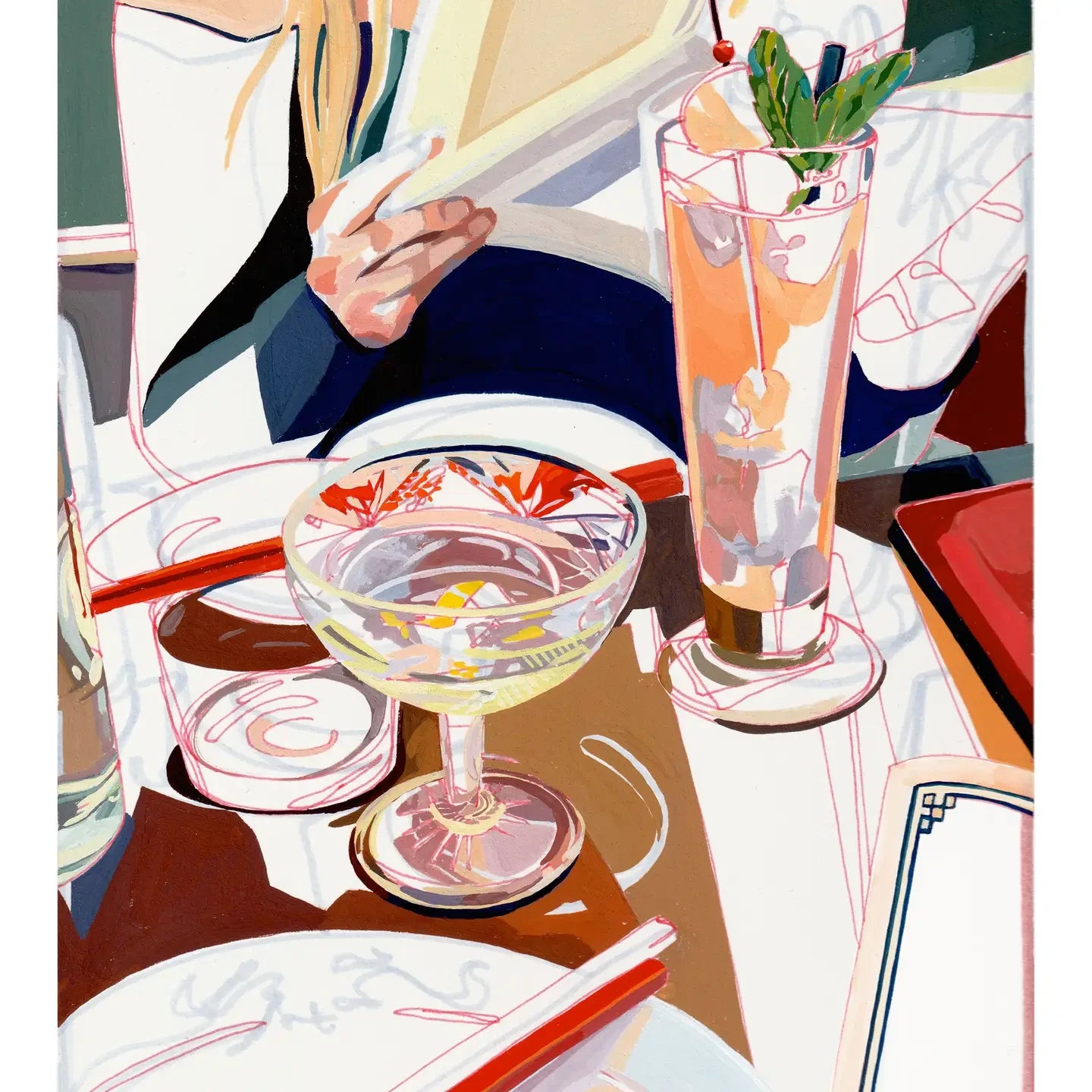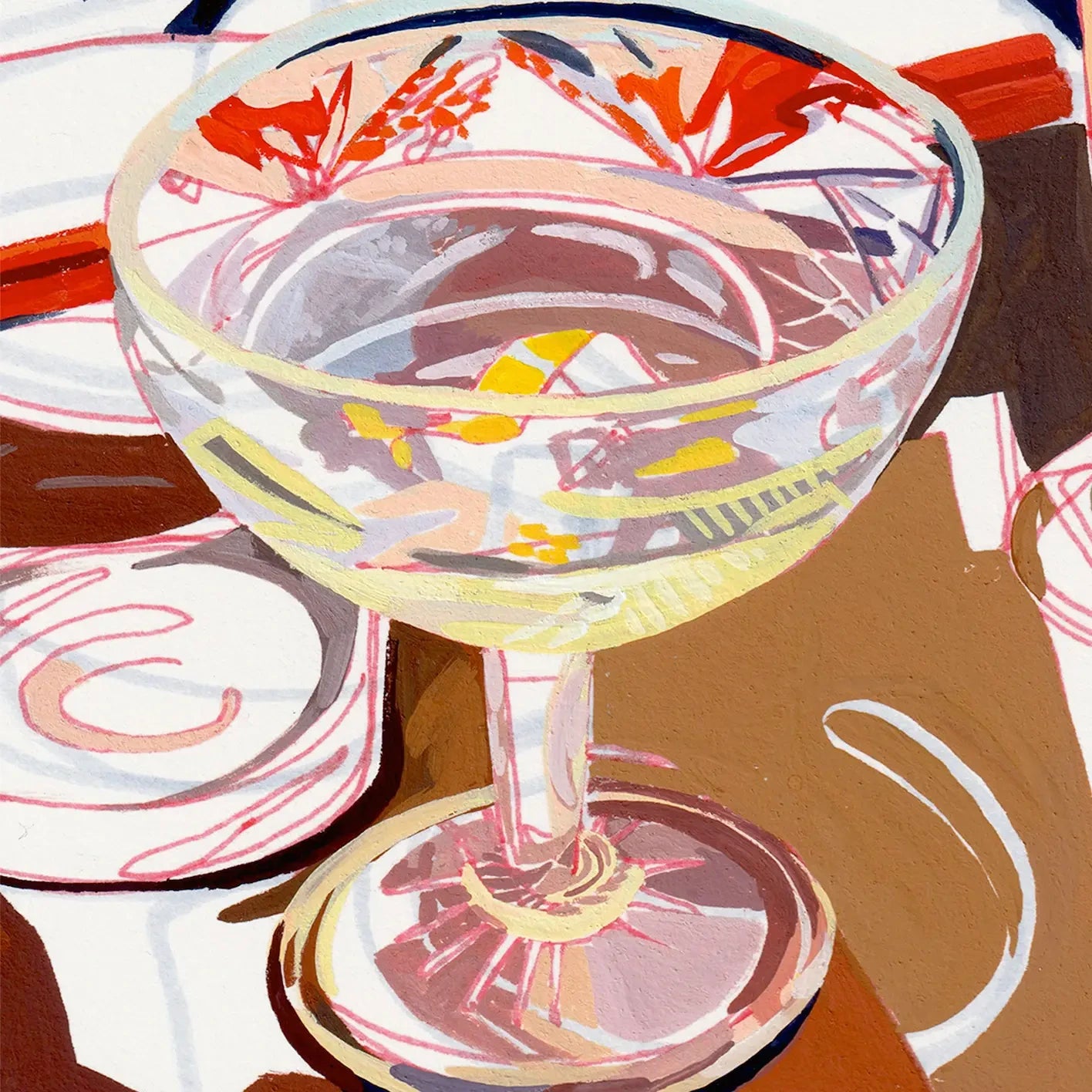 Pinkies up! This vibrant gouache and pen painting by Anissa Riviere is transformed into a signed archival quality giclee print. This still life features an elegant martini with a lemon twist in a cut crystal glass. Inspired by dinner and drinks in a Chinese restaurant in Manhattan, high quality pigment inks bring this print to life. This wall art print would be perfect for the kitchen, above a bar cart, or in a gallery wall.