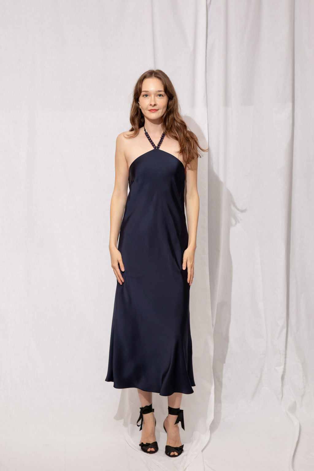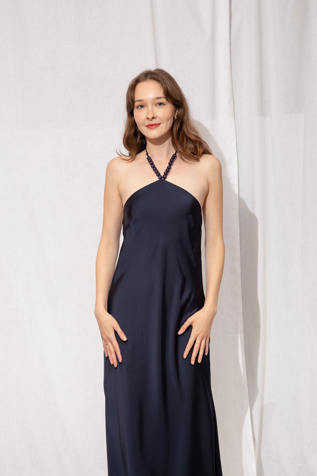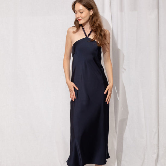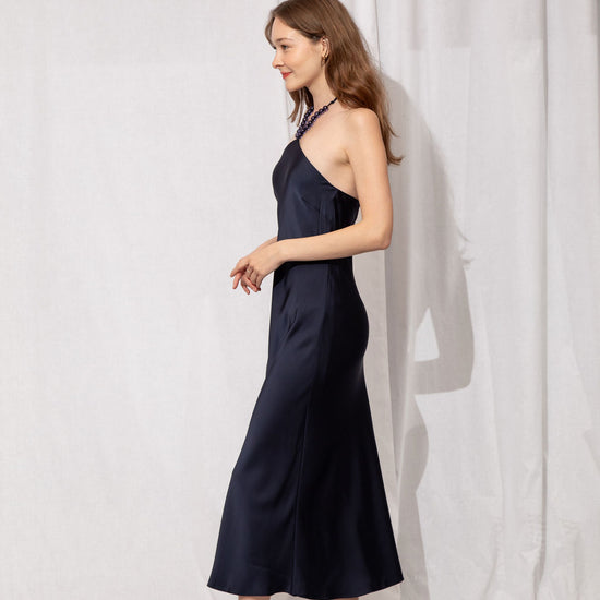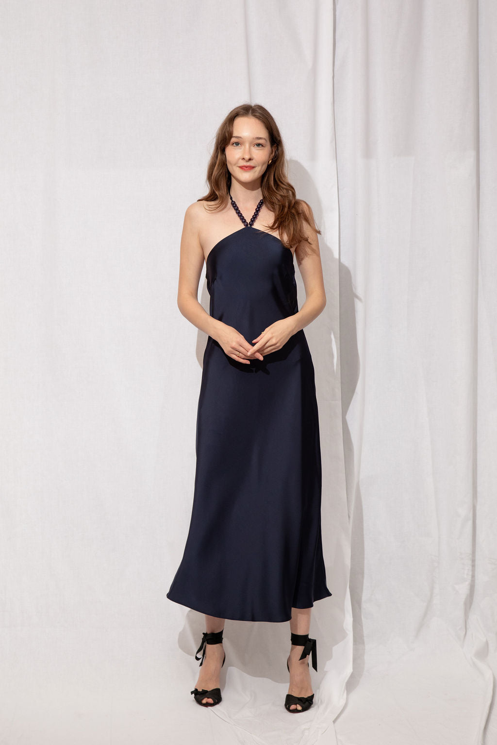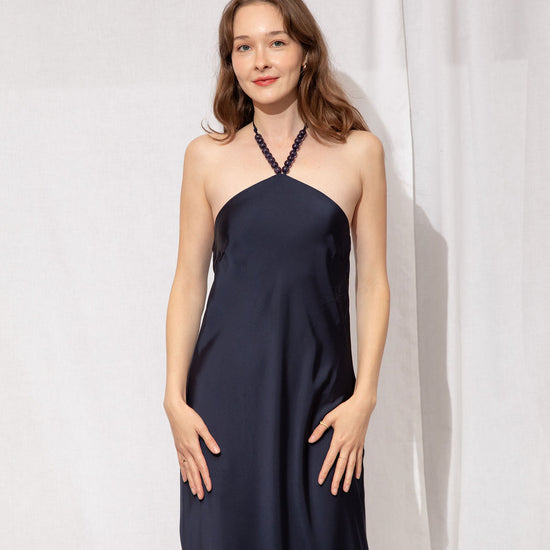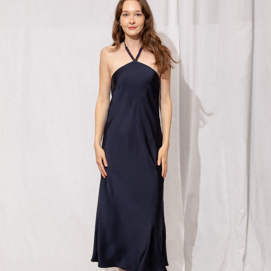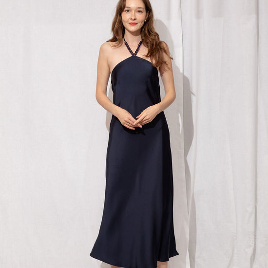 Meet your new showstopper. The Mica Halter Dress comes in a gorgeous navy satin that catches the light with every move. The halter ties are finished with delicate bead detailing—just the right amount of sparkle without trying too hard. Its sleek midi silhouette is perfect for weddings, dinner parties, or any night you want to feel effortlessly stunning.