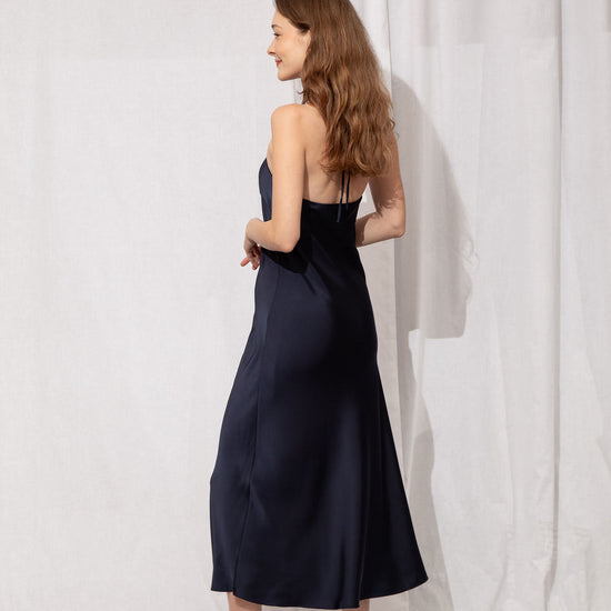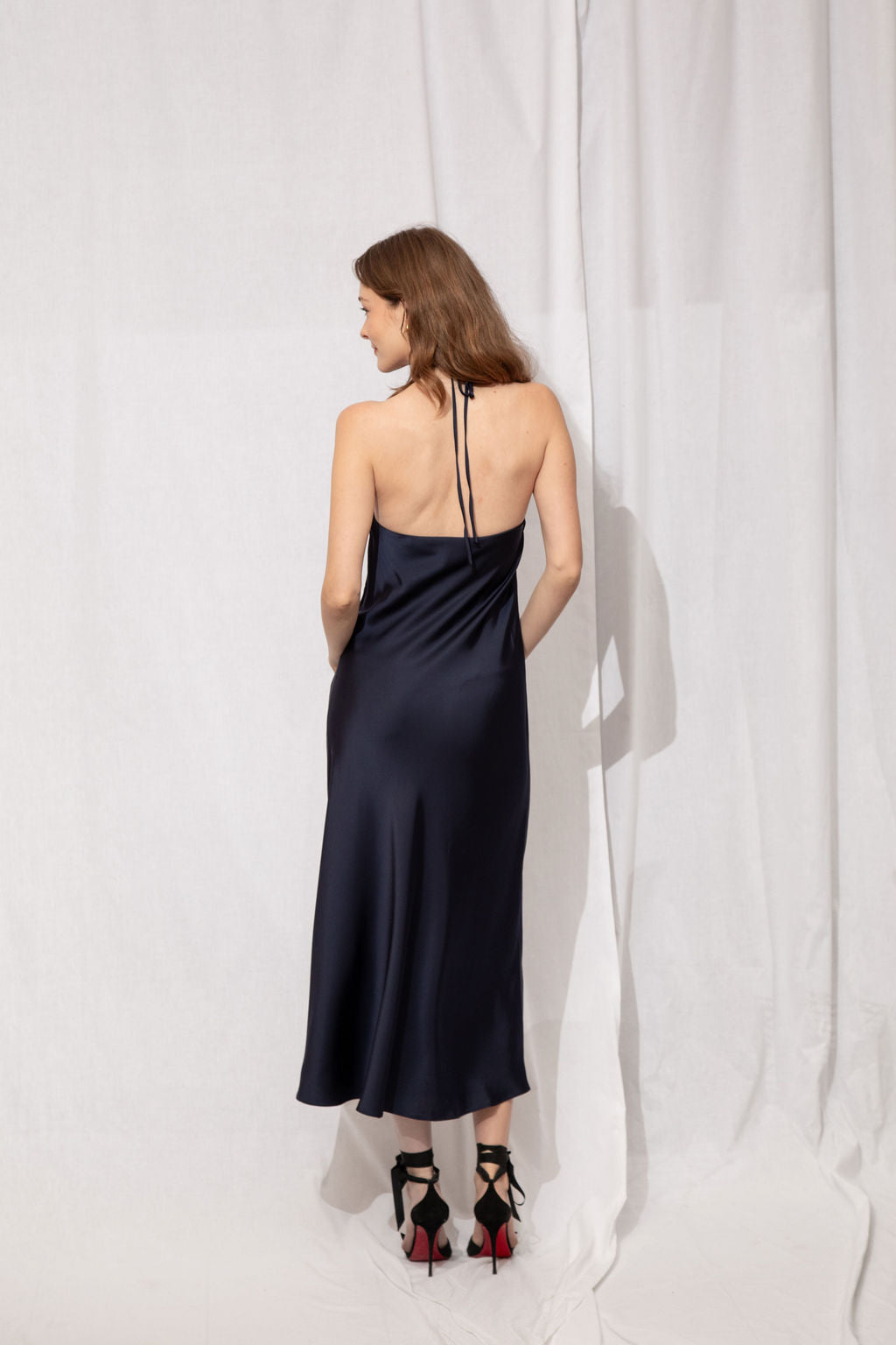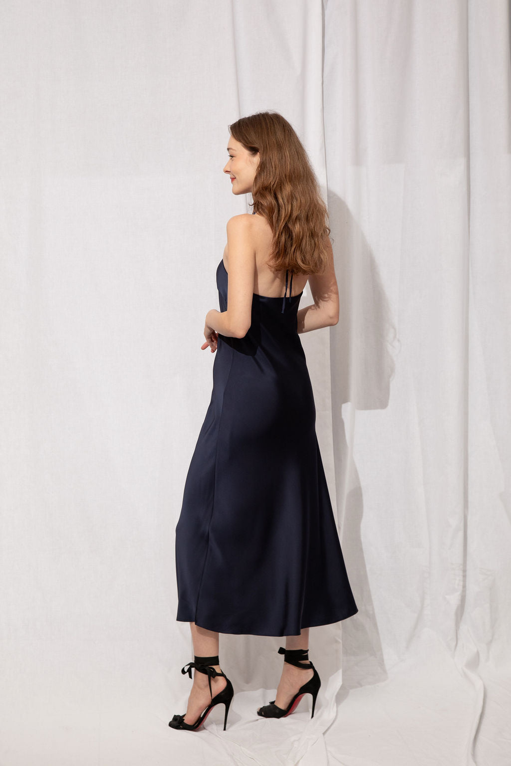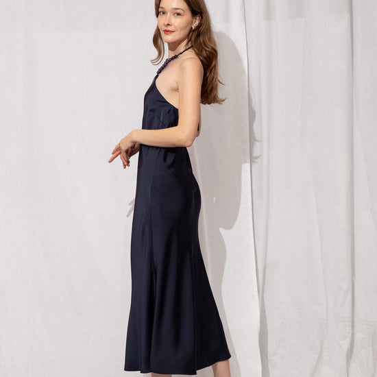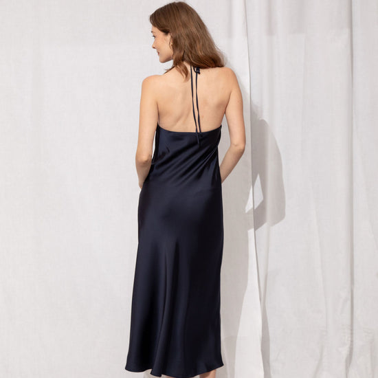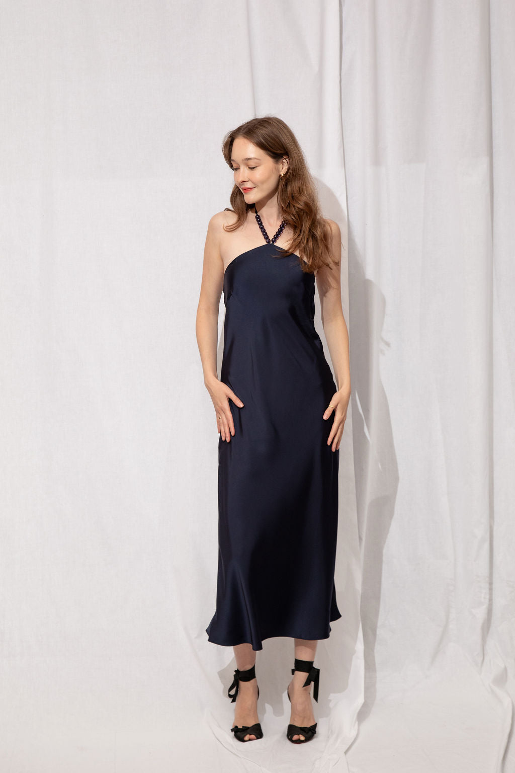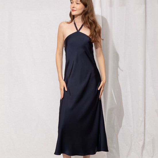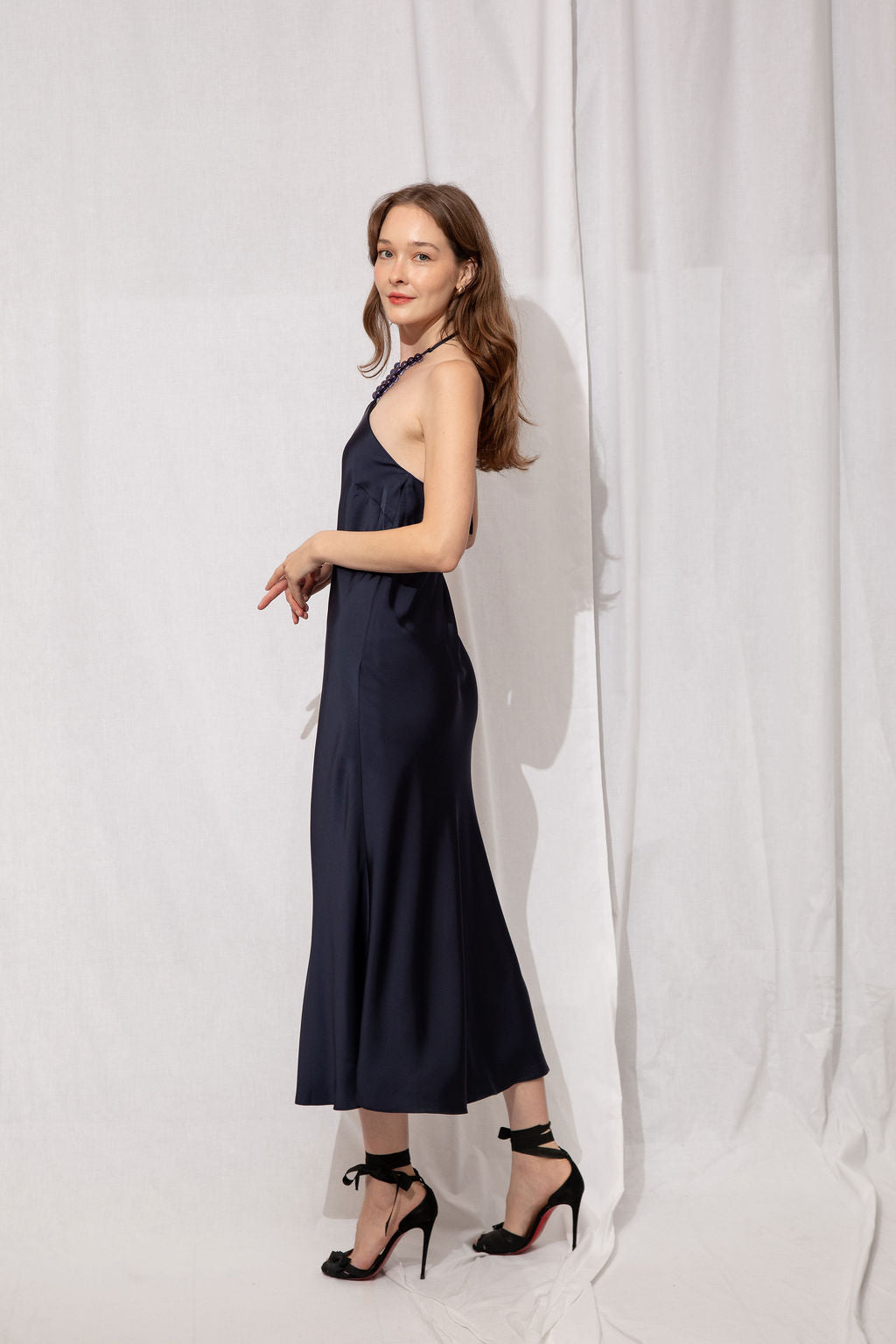 Meet your new showstopper. The Mica Halter Dress comes in a gorgeous navy satin that catches the light with every move. The halter ties are finished with delicate bead detailing—just the right amount of sparkle without trying too hard. Its sleek midi silhouette is perfect for weddings, dinner parties, or any night you want to feel effortlessly stunning.