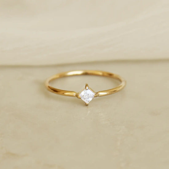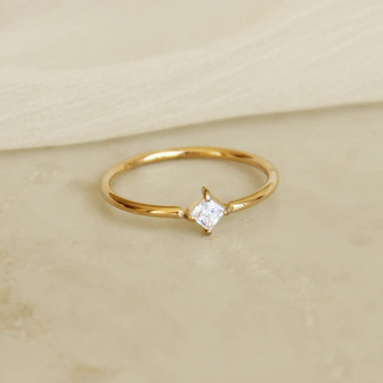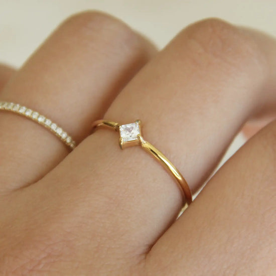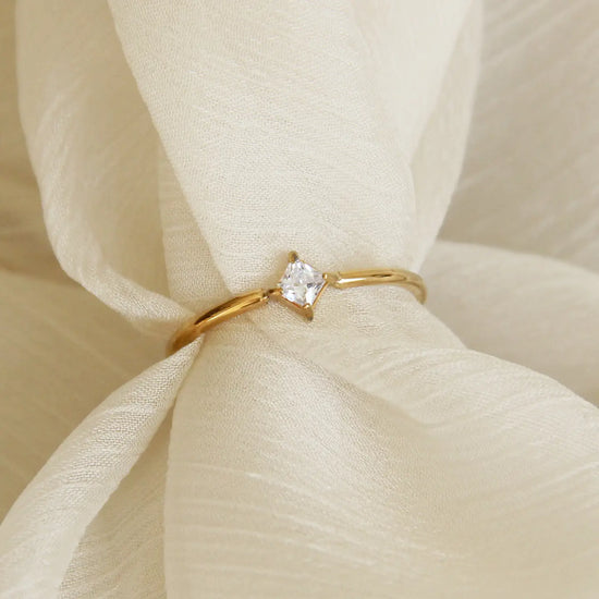 Sleek and timeless, the Adela Ring features a bold square-cut CZ set on a slim, delicate band. Its clean lines and modern silhouette make it an elegant statement piece you’ll reach for daily—whether worn solo for a touch of sophistication or stacked with your favorite bands for added sparkle. ✨