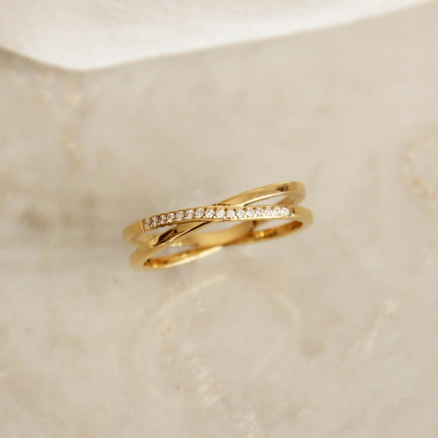 The Lucia Ring is a sleek crossed double band design with pave details for just the right amount of sparkle. Minimal yet striking, it’s the perfect everyday ring that layers effortlessly with your other favorites.