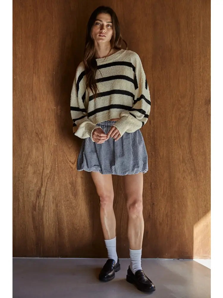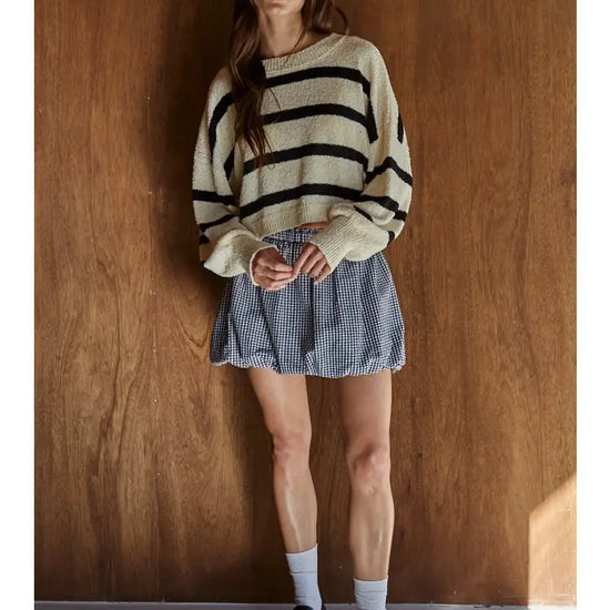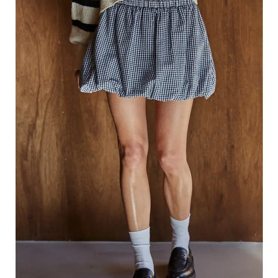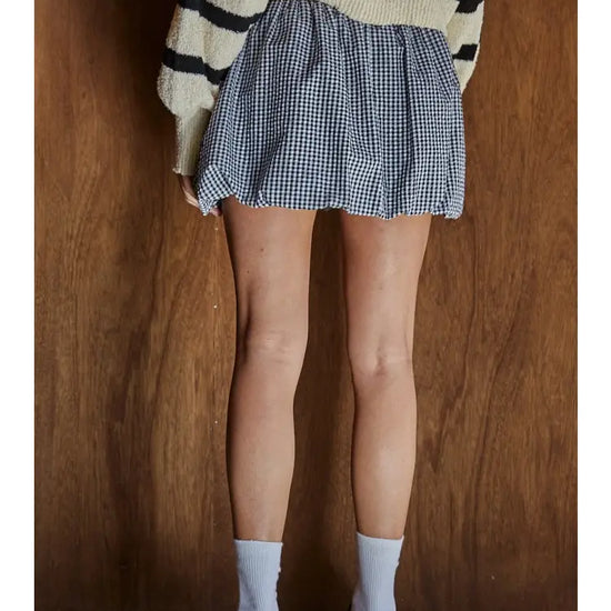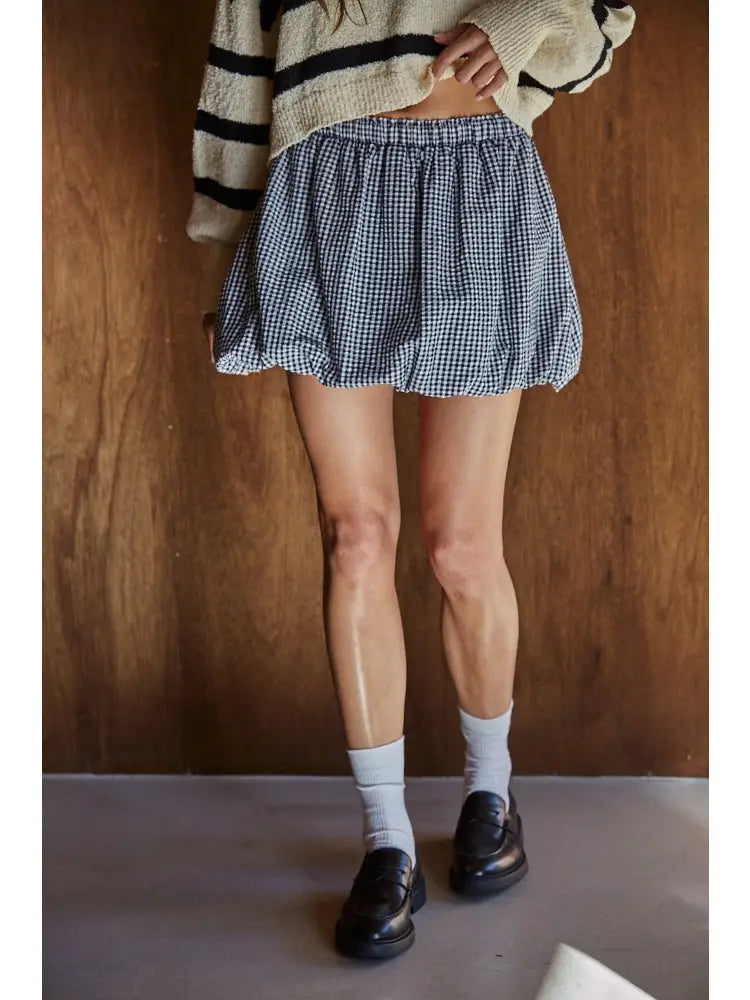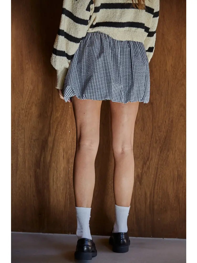 Add a playful twist to your fall wardrobe with the Daphne Bubble Skirt. Featuring a woven gingham print and a comfortable elastic waist, this bubble skort combines style and ease. Hidden shorts underneath let you move freely and confidently, making it perfect to pair with an oversized sweater for a cozy, chic look.