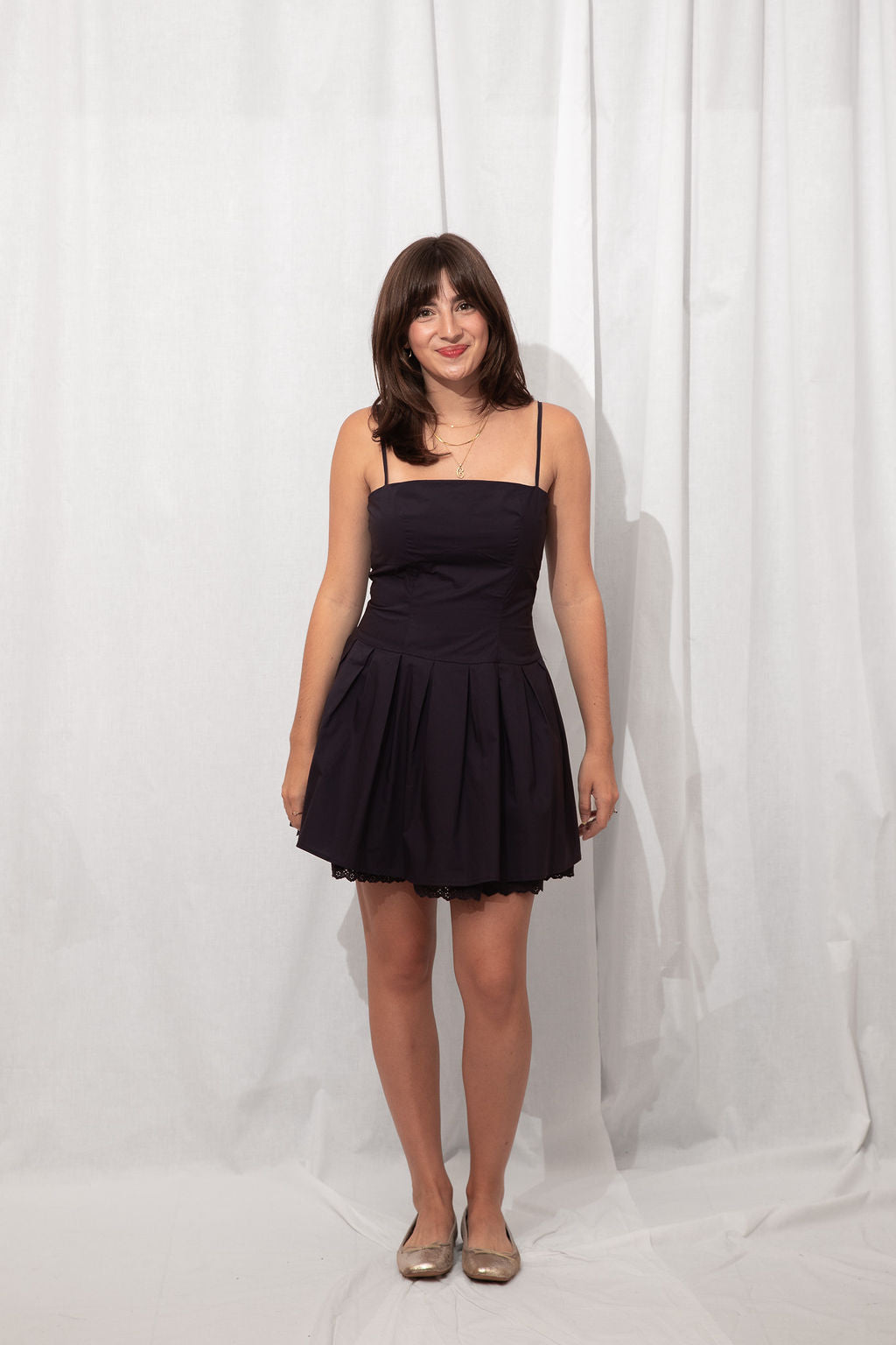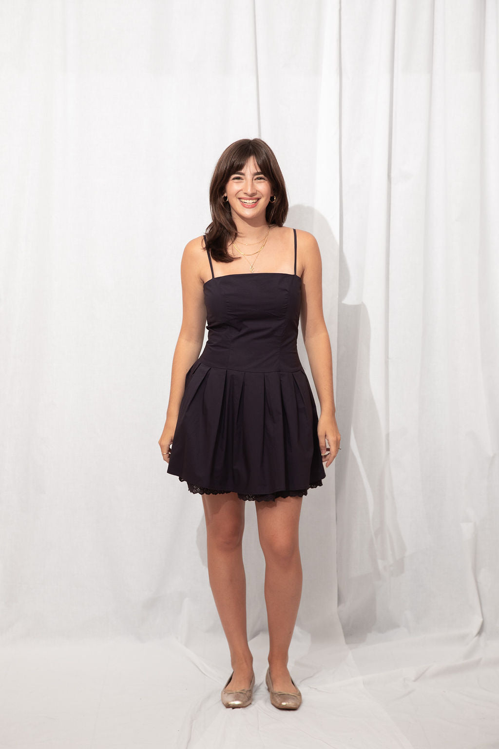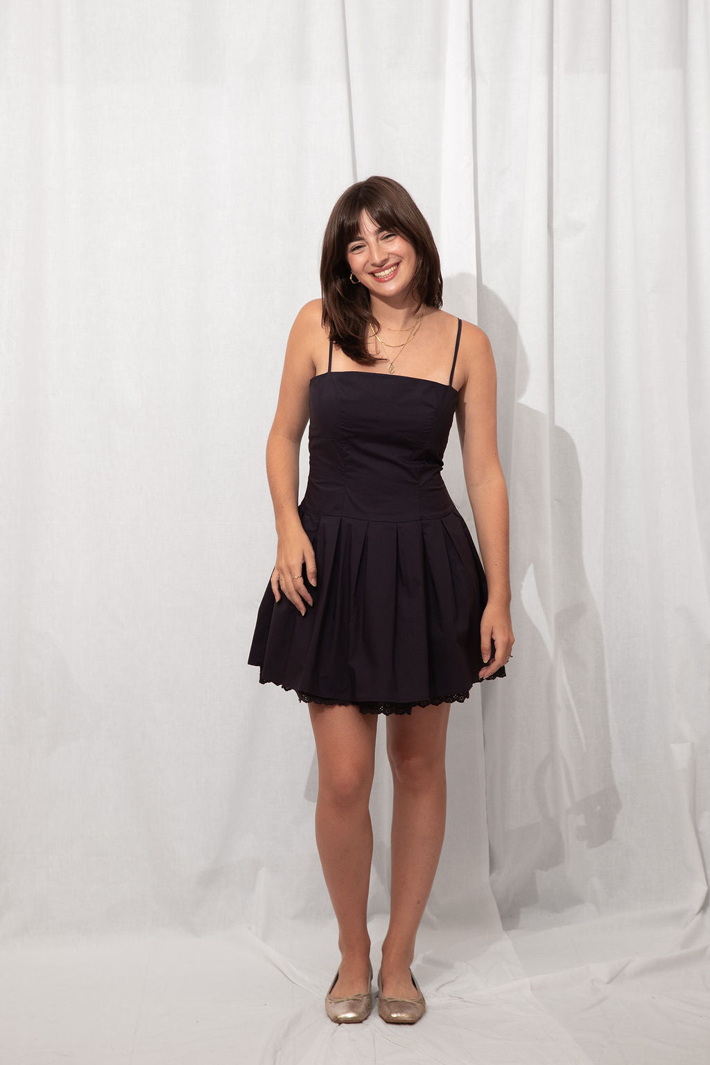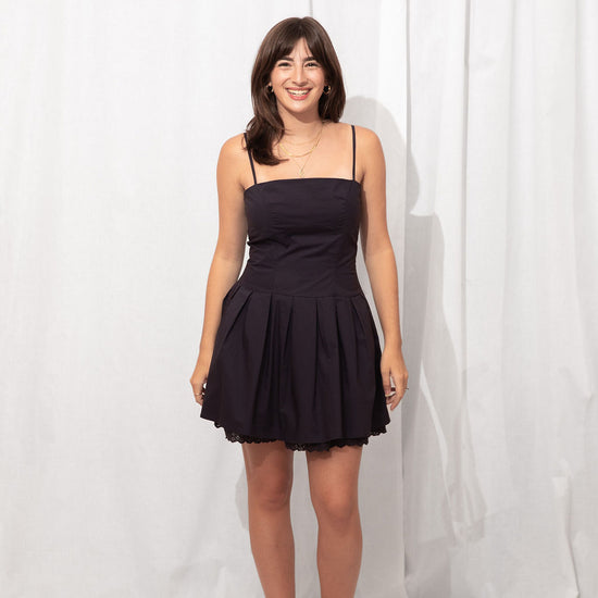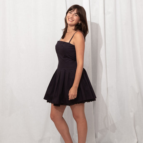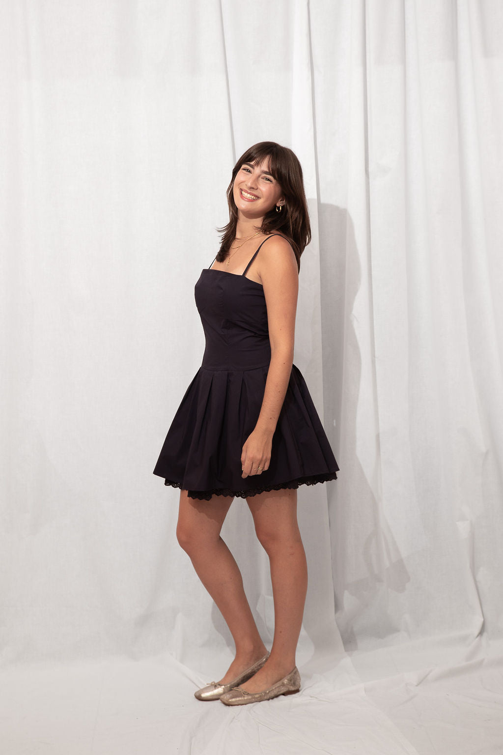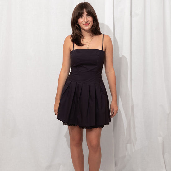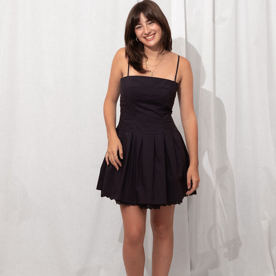 A flirty little mini with all the right details—Simone in navy stuns with a square neckline, skinny spaghetti straps, and a pleated skirt that moves with you. Finished with a delicate eyelet lace hem and made from 100% cotton, she's sweet, breathable, and perfect for sunshiny days. Hidden back zipper keeps the fit smooth and easy.