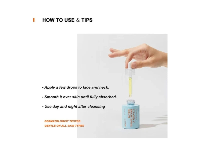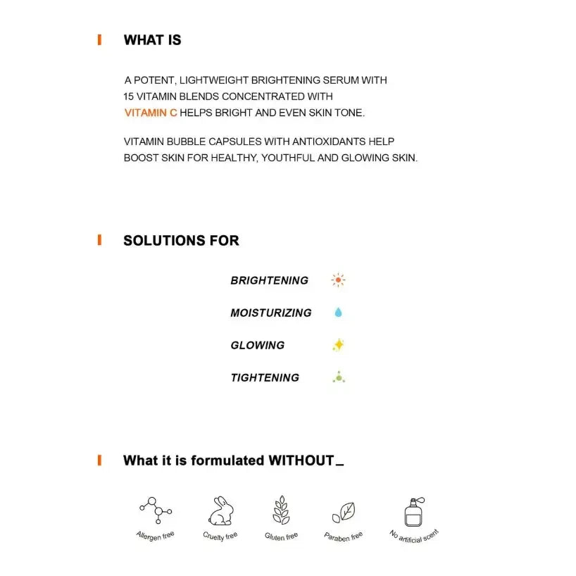 Vitamin C Brightening Serum is a potent and lightweight brightening serum containing a blend of 15 vitamins with concentrated vitamin C that helps brighten and even out the skin tone.