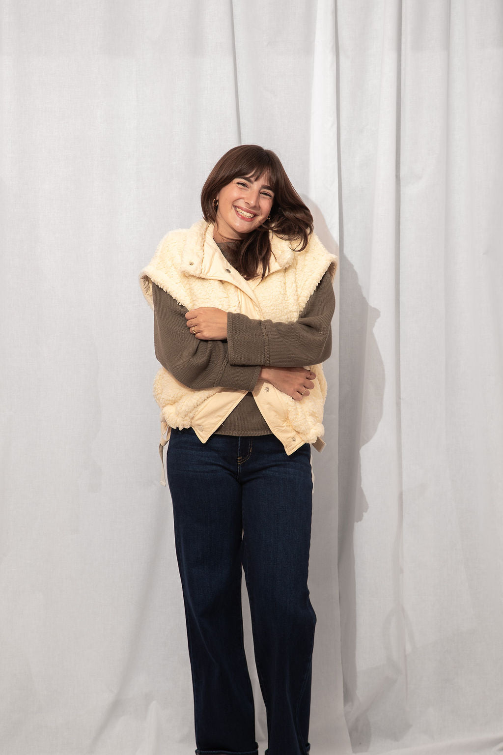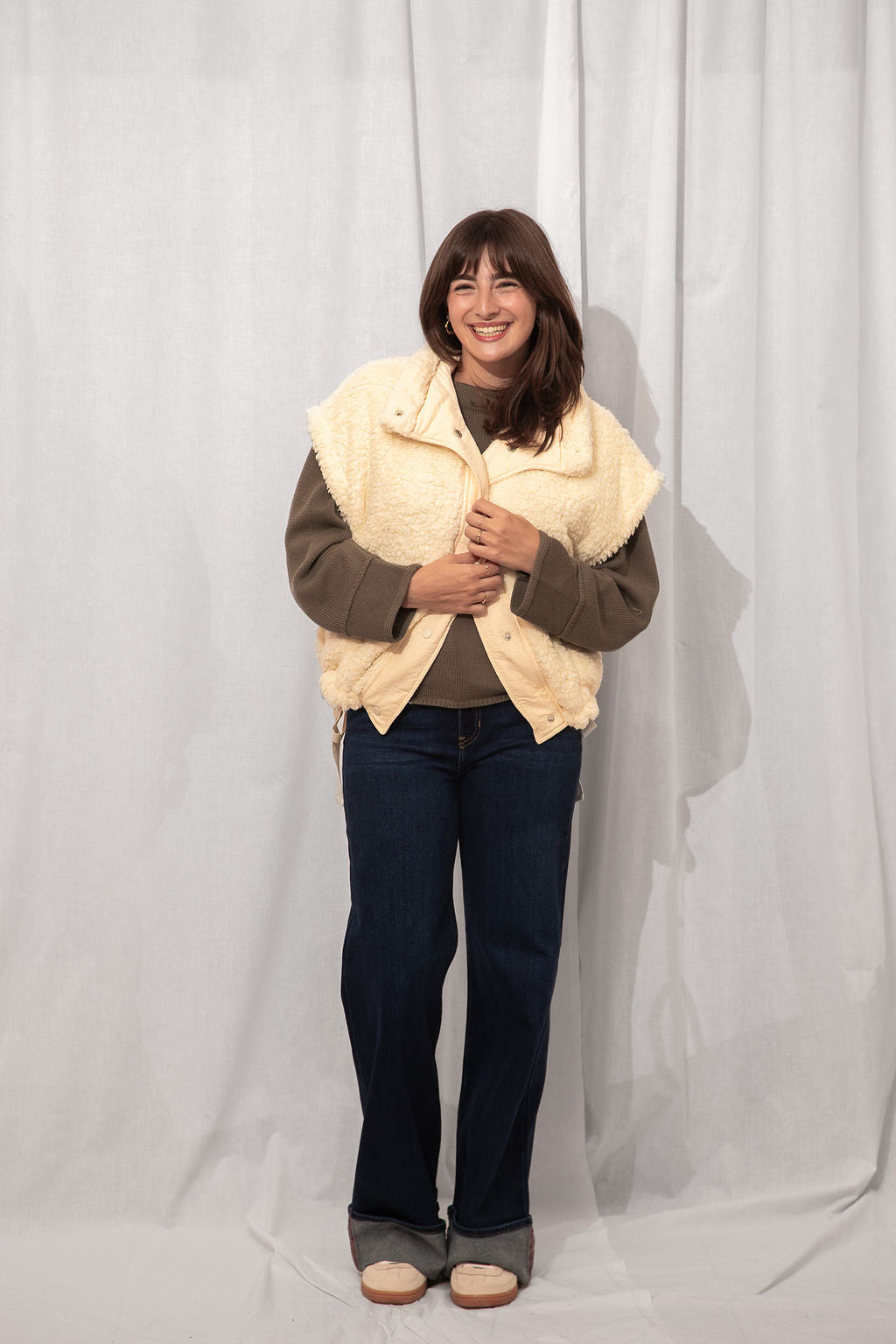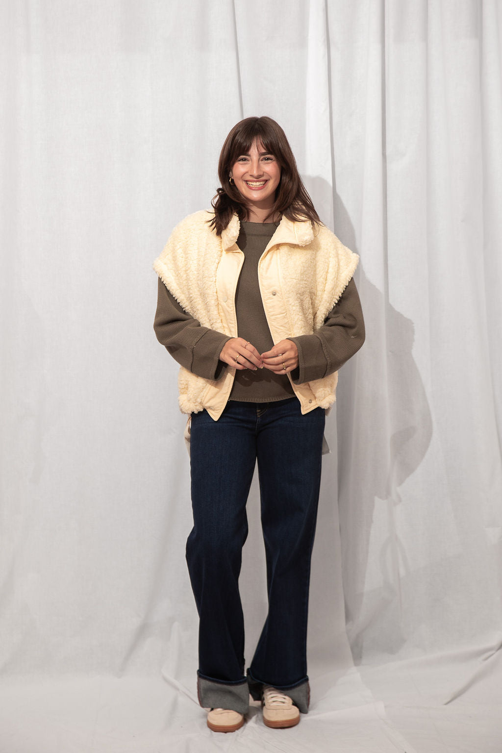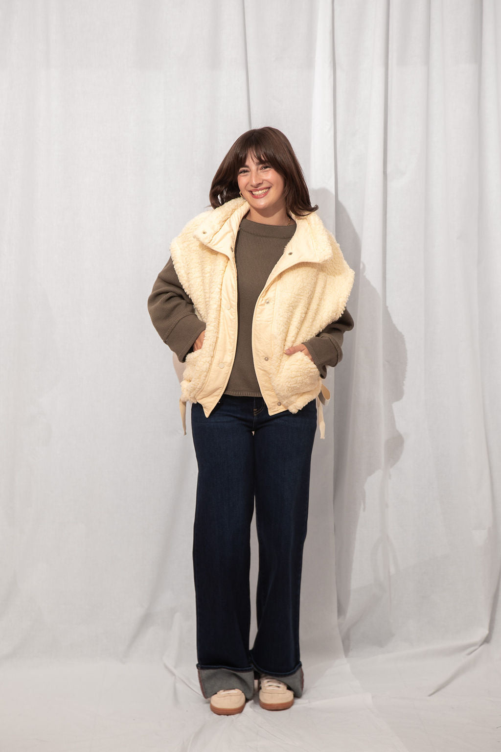 The coziest layer you didn’t know you needed. Made from ultra-soft teddy fabric in the dreamiest cream shade, this utility-style vest is fall's best friend.