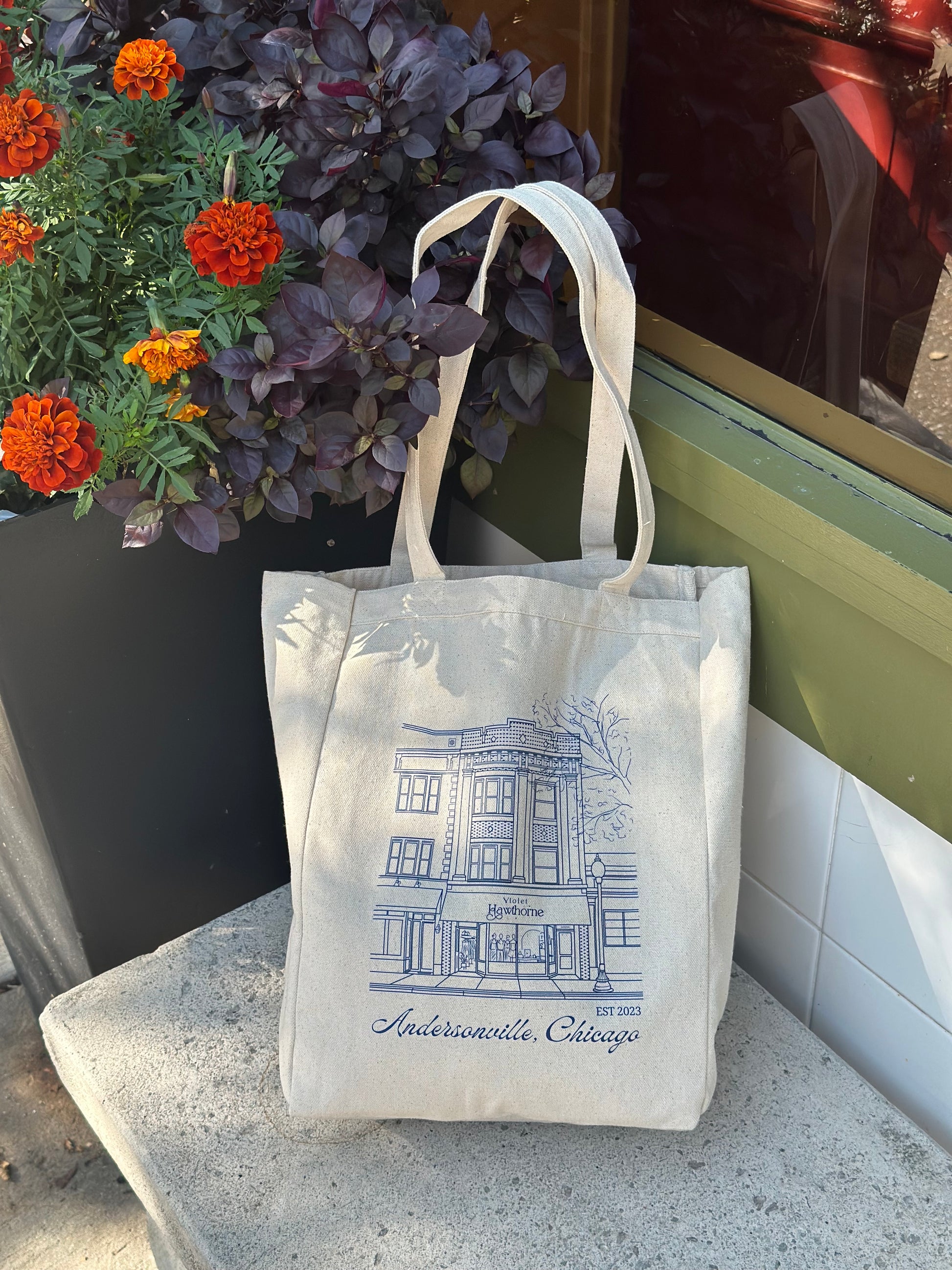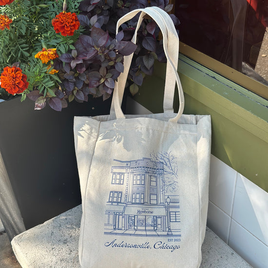 Our exclusive Violet Hawthorne Tote is a love letter to Andersonville. Featuring a custom line drawing of our storefront, illustrated by artist Lera, this tote is both stylish and sentimental. Designed to celebrate the neighborhood that’s welcomed us so warmly, it’s the perfect everyday bag for errands, markets, or a stroll down Clark Street. A piece of Violet Hawthorne you can carry with you everywhere.