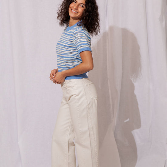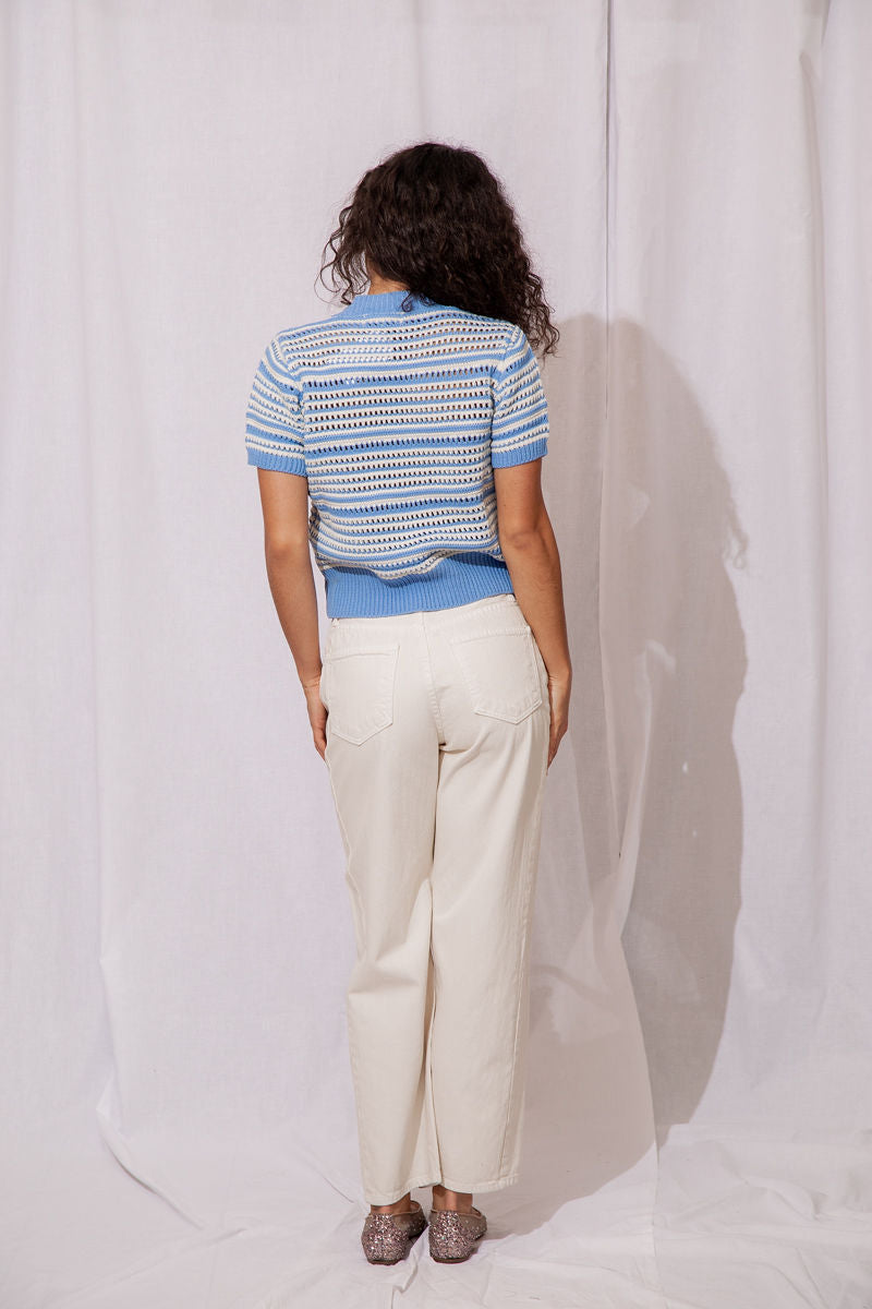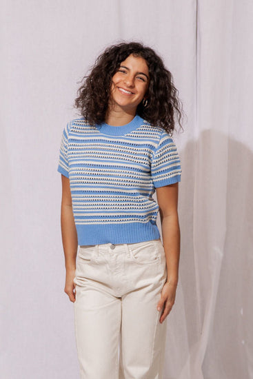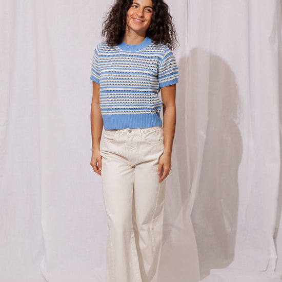 - Soft and comfy knit in a dreamy hydrangea blue and ivory stripe