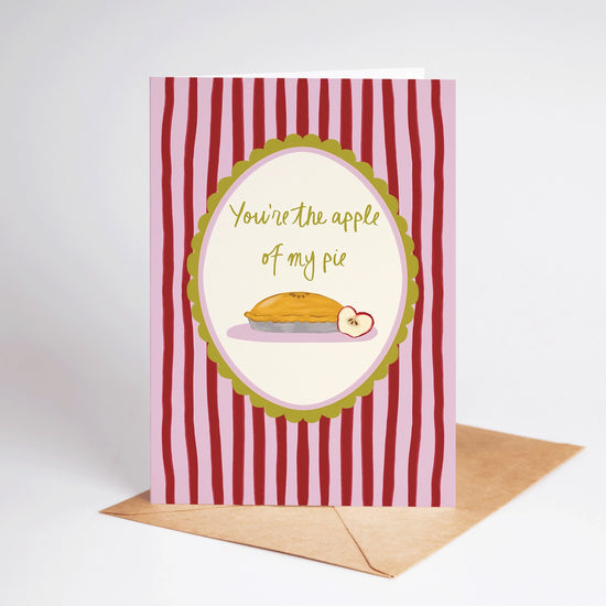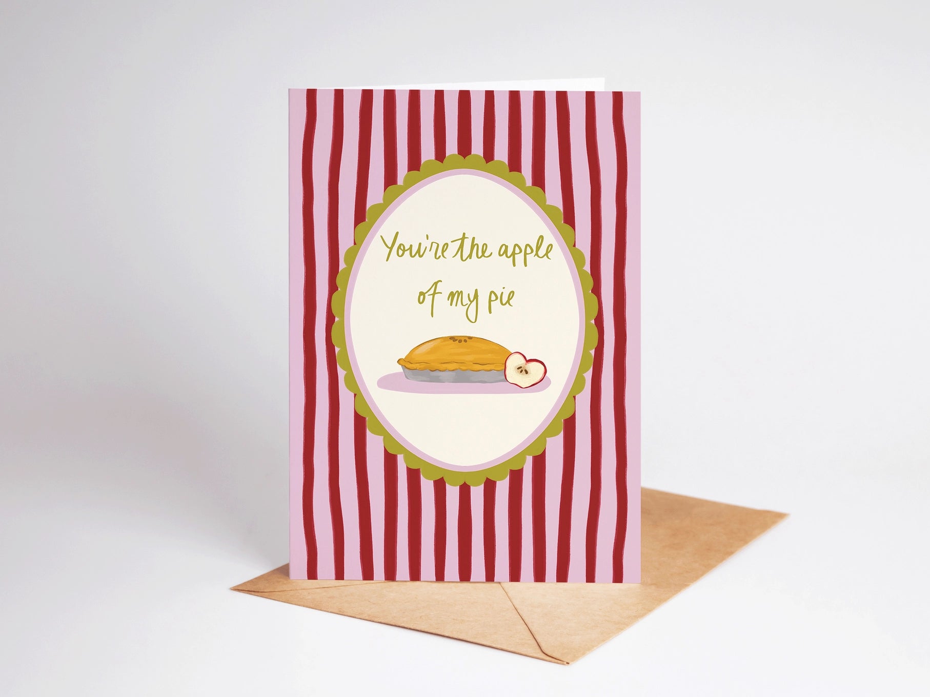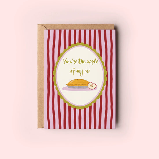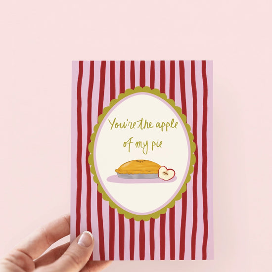 Send warm fall vibes with this charming 5x7 card! 🍁 Featuring a delicious apple pie on a cozy striped background and the punny phrase "You're the apple of my pie" 🥧🍎, it’s perfect for celebrating fall, sending a sweet note, or brightening the day of any pie or apple lover. Blank inside for your personal message 💌, it includes a brown kraft envelope and comes safely tucked in a clear plastic sleeve. Original artwork by Lauren Shelley adds a delightful touch to every greeting! 🌟